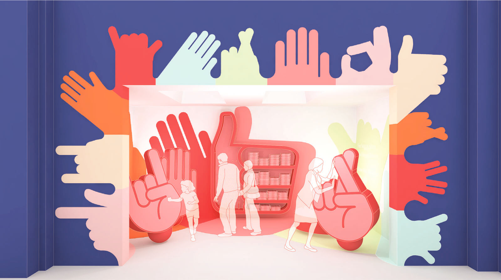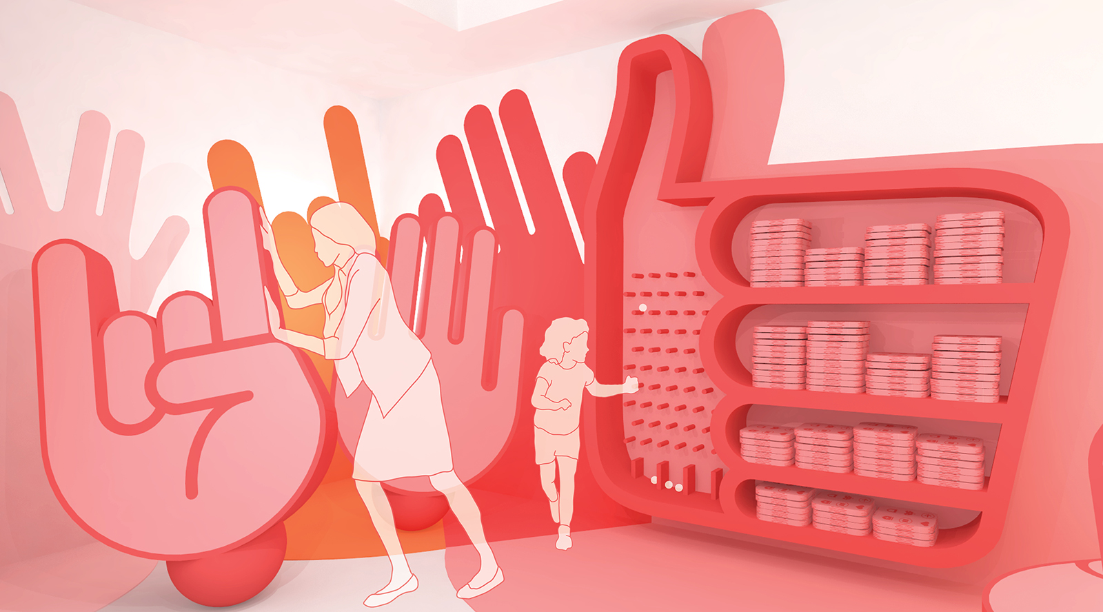 These public installations make architectural space in around the forms of foam hands paraphernalia worn by sports fans. While typical foam hands are often limited to a "We're #1" finger gesture, the hand forms explored in this project encompass a broad range of communicative hand gestures inspired by the emoji lexion. In one arena box, 'The Wobble Room,' visitors are invited to interact with and activate a series of life-size hand emoji forms, animating them into friendly waves of greeting. In another room, 'The Handstand,' visitors can inhabit the hollowed-out interiors of the hand gesture forms, cuddling up into an intimate nook or resting on a shapely bench. Colorful graphics and shadow projections on the wall create of rich and immersive environment of hand-based visual communication.