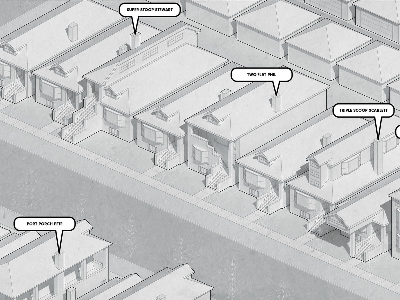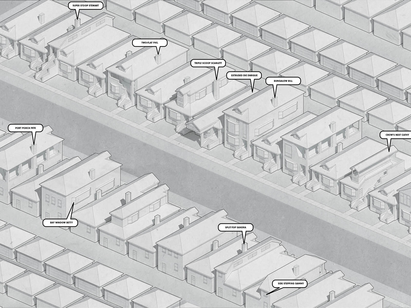 Bungalow Futures responds to a contemporary debate about preservation practices for Chicago’s historic bungalows. The Historic Chicago Bungalow Association’s recent #StopThePop social media campaign aims to curtail “bad” home additions that they argue destroy the historic character of the building type. Their accompanying design manual promotes a static image of bungalow streetscapes by ensuring that new additions to bungalows remain invisible to public view along the street (interior renovations remain acceptable). However, developers engaged in renovating bungalows by adding “pop tops” rebut that they are simply satisfying the expanded space and lifestyle needs of their clients. Bungalow Futures posits a third way in which the character of the bungalow might be preserved even if the typology evolves and mutates. The series rejects the preservation tactics of the #StopThePop campaign, but is both serious and playful in its commitment to preserve the bungalow’s architectural identity as articulated through its facade, floor plan, and ornamental details. The project proposes “other” possibilities, aesthetics, and cultures for Chicago’s beloved bungalows. #OnceYouPopYouCantStop