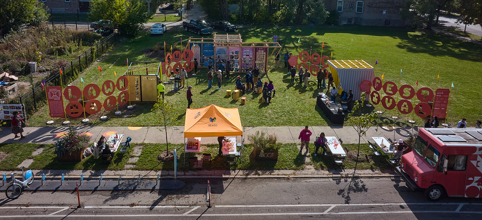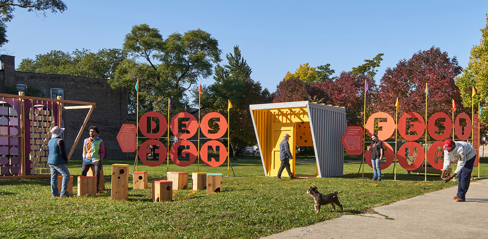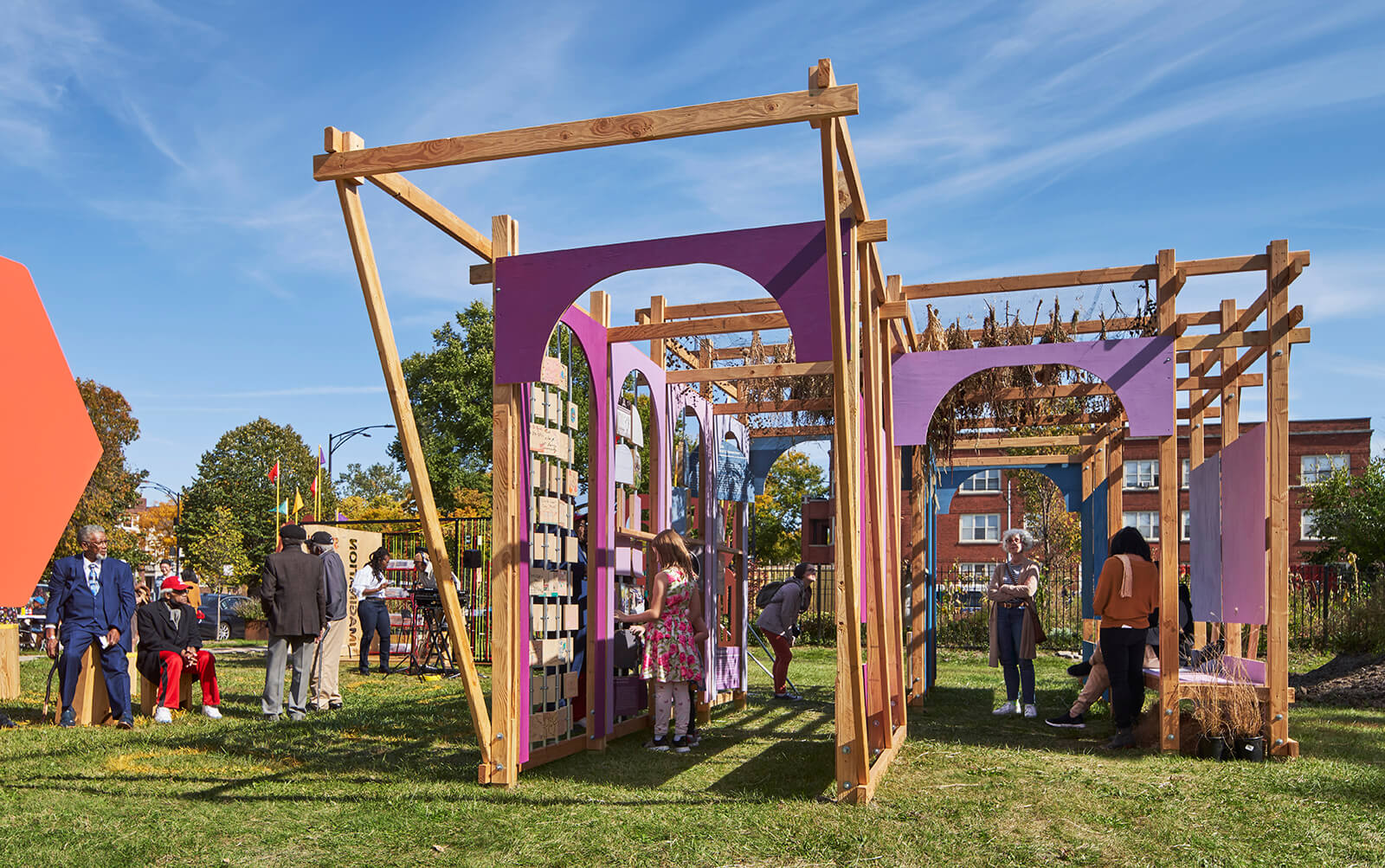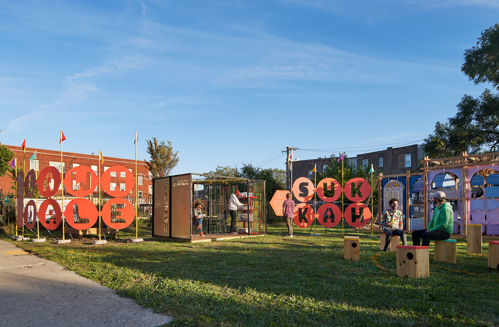 The Chicago Sukkah Design Festival pairs community organizations in Chicago’s North Lawndale neighborhood with diverse architectural designers to design and construct sukkahs, small outdoor pavilions built for the Jewish holiday of Sukkot. Working collaboratively, teams explore design literacy, social justice, and neighborhood futuring. The Festival celebrates cultural heritage and amplifies solidarity among the Jewish community who lived there historically, the predominantly Black community that resides there today, and the broader Chicago community. It engages the neighborhood's multicultural history, builds interfaith partnerships, and elevates the role of design in building an anti-racist city. During the week-long Festival, the landscape of unique sukkah structures is activated with cross-cultural public programming, co-organized with the Lawndale Pop-Up Spot, bringing together intersectional pairings of neighborhood groups. After the Festival, each sukkah is relocated and re-installed at the facilities of the community organizations that co-designed them, as vibrant new permanent spaces; for example, micro-museums, neighborhood farmstands, and book nooks.