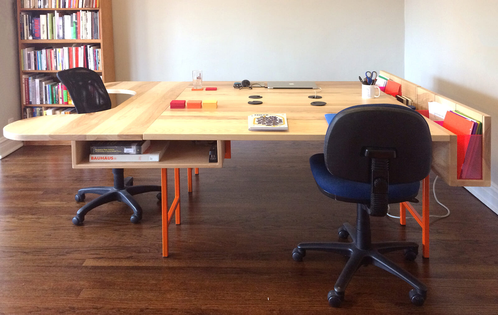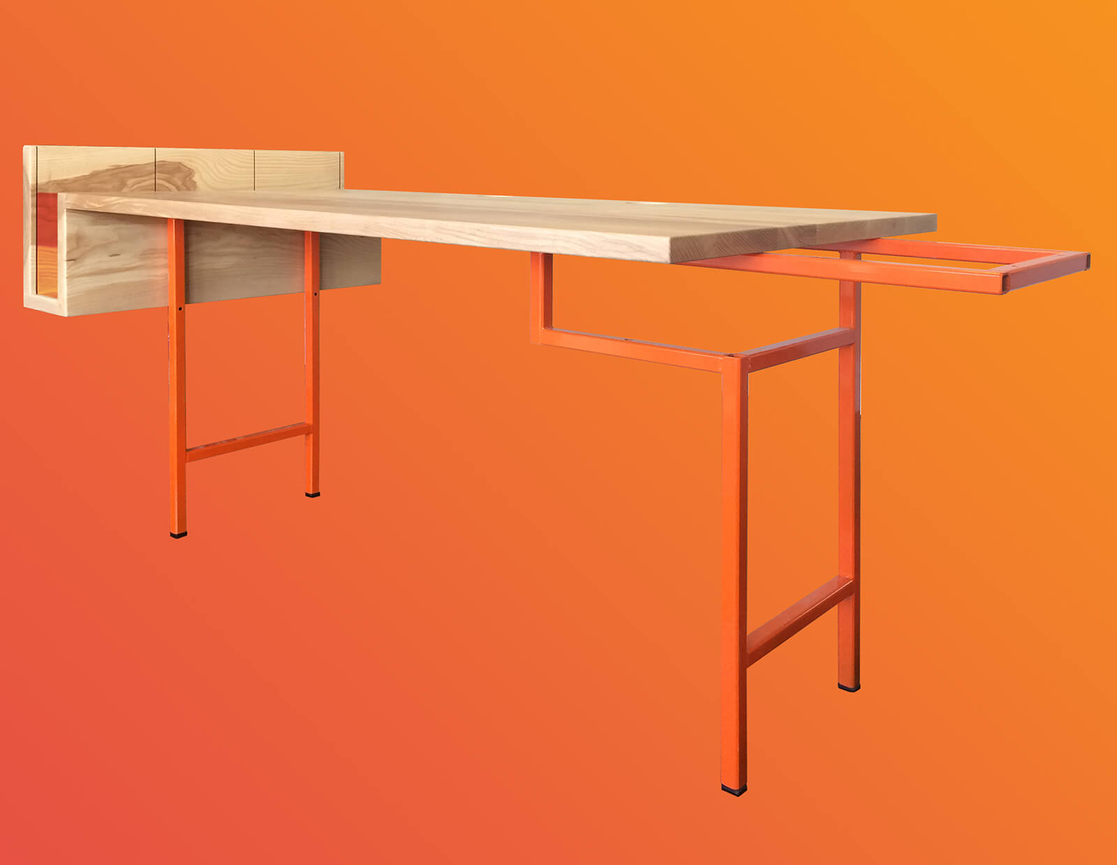 —Theo the Three-Person Desk: reclaimed ash on powder-coated steel tube base.