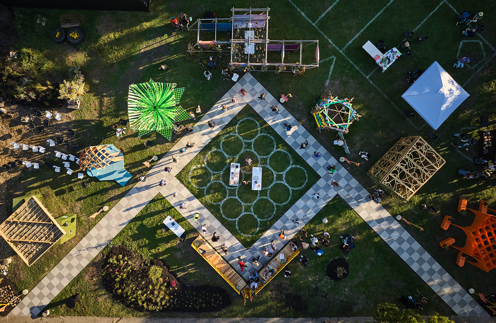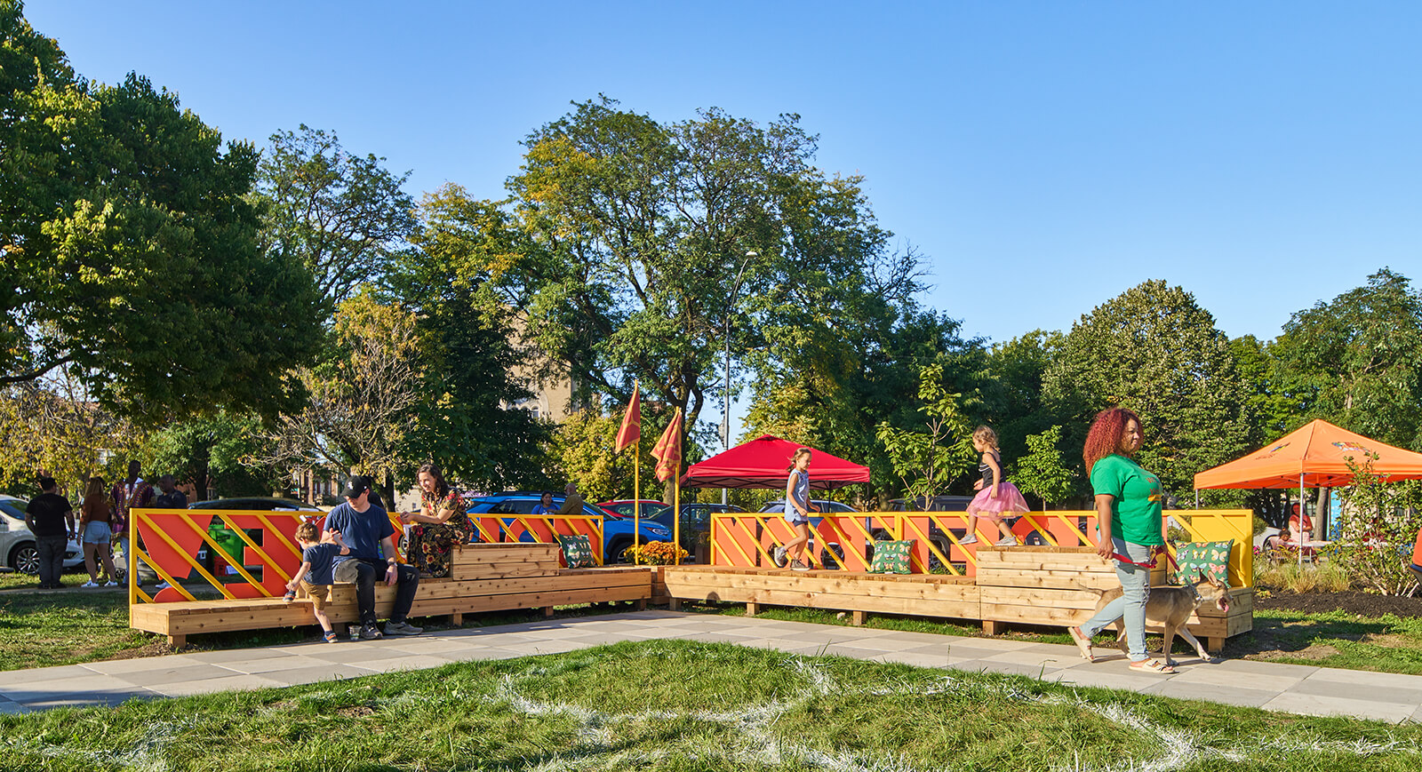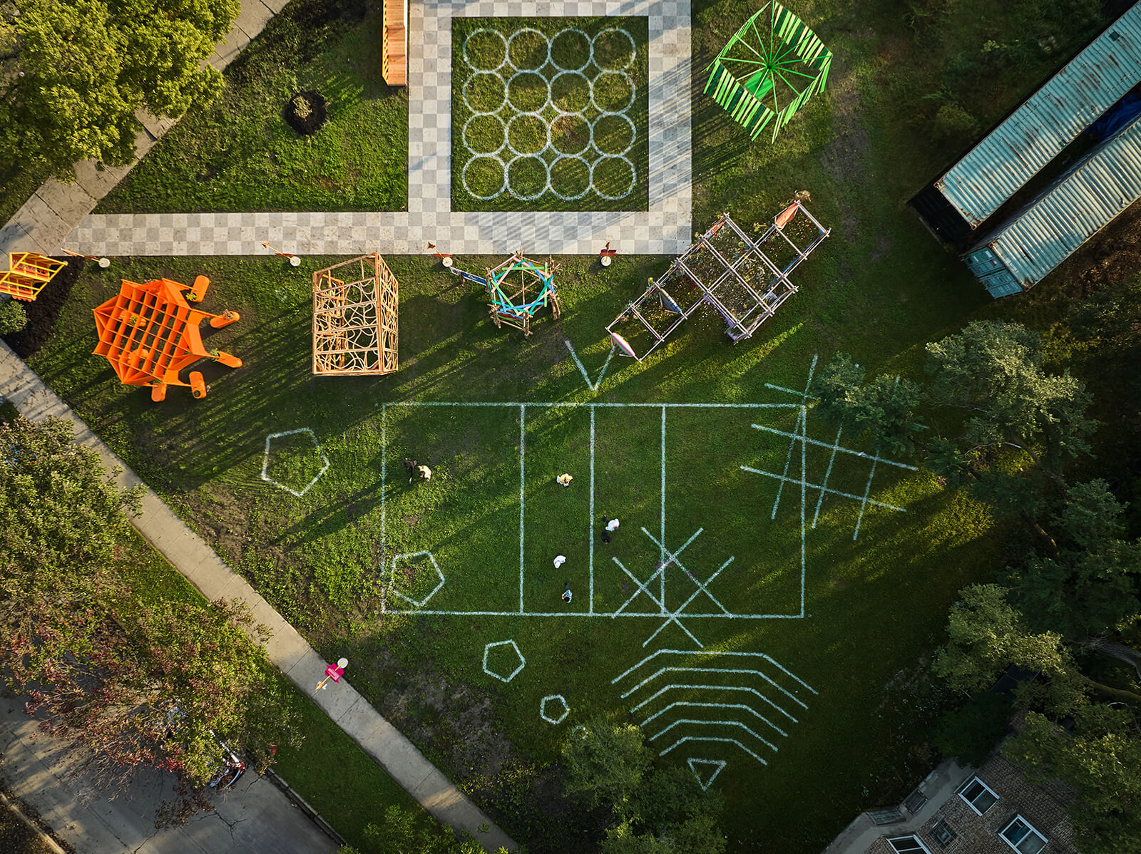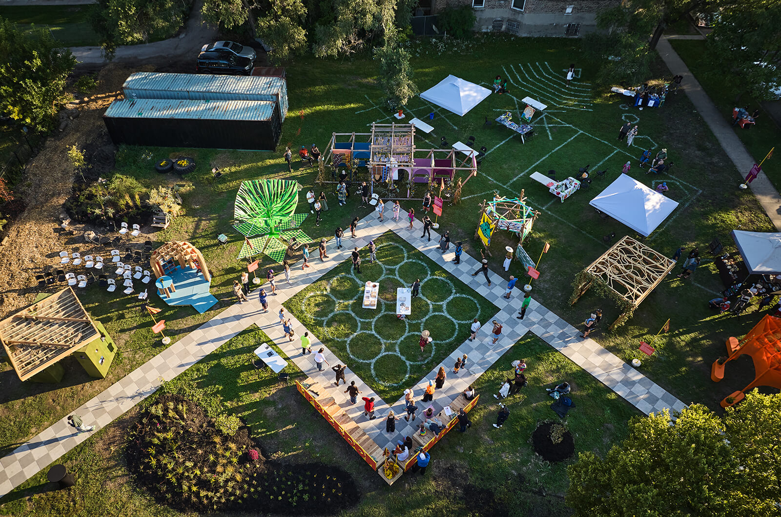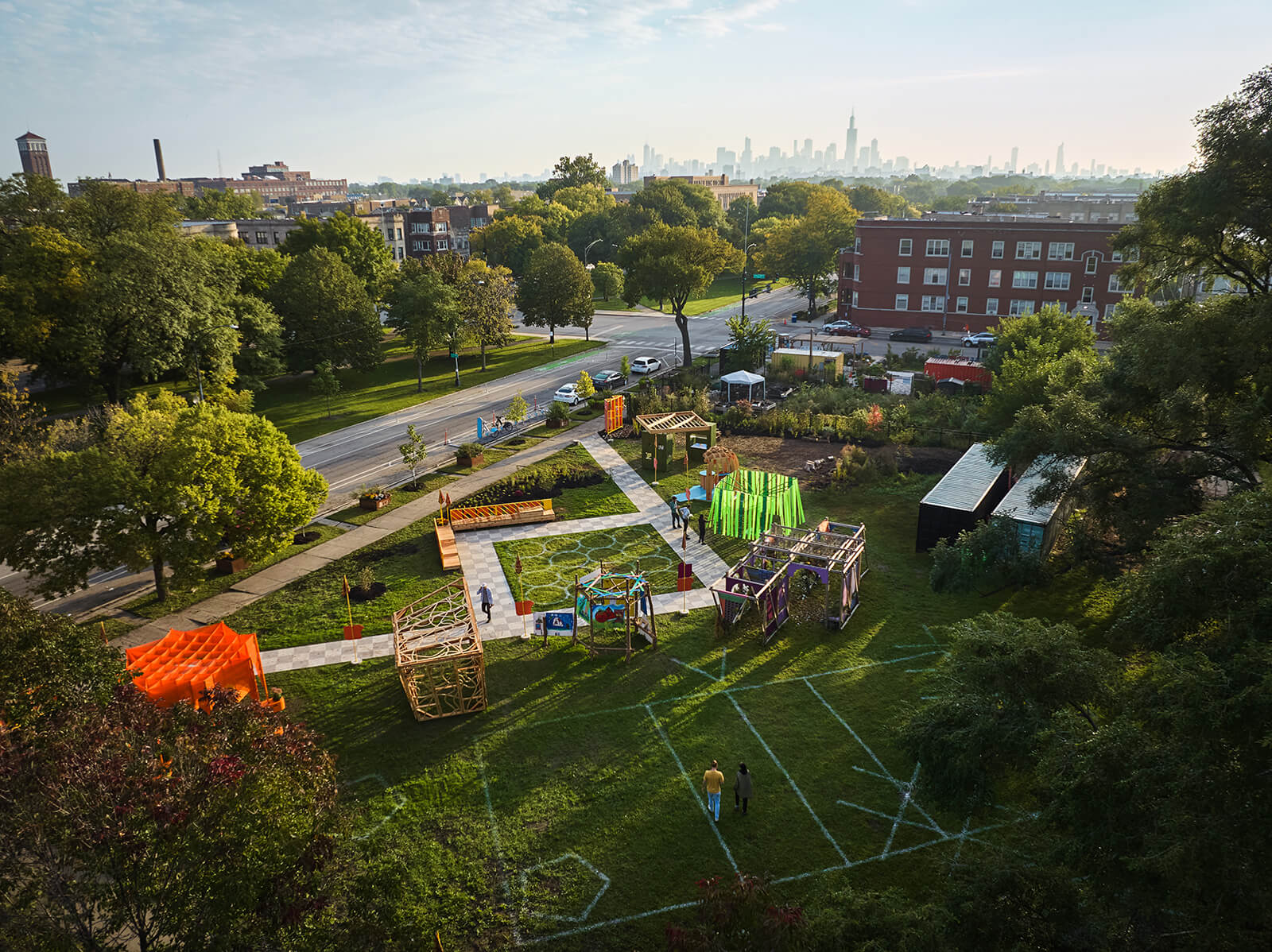 James Stone Freedom Square is a new public plaza in Chicago’s North Lawndale neighborhood. It also serves as the dedicated outdoor venue and festival grounds for the Chicago Sukkah Design Festival, an annual public art and architecture exhibition of outdoor pavilions that celebrates cultural heritage and interfaith/interracial solidarity. During the Sukkah Design Festival, the landscape of James Stone Freedom Square is activated with cross-cultural public programming, bringing together intersectional pairings of neighborhood groups. While the sukkah pavilions are moved from this plaza and re-installed in the permanent homes of participating community partner organizations after each annual Sukkah Design Festival, James Stone Freedom Square features permanent site amenities, including an accessible pathway, signage and branding components, and outdoor seating that contribute to an ongoing creative placemaking effort to expand the neighborhood’s outdoor public program spaces. James Stone Freedom Square is also the central hub of Stone Temple Baptist Church’s extended neighborhood campus. In partnership with Lawndale Pop-Up Spot, a community museum in a shipping container located adjacent to James Stone Freedom Square, the church activates the plaza with year-round community programming, including a healthy food distribution program, a farmers’ market, movies in the park, and kite-flying festival.