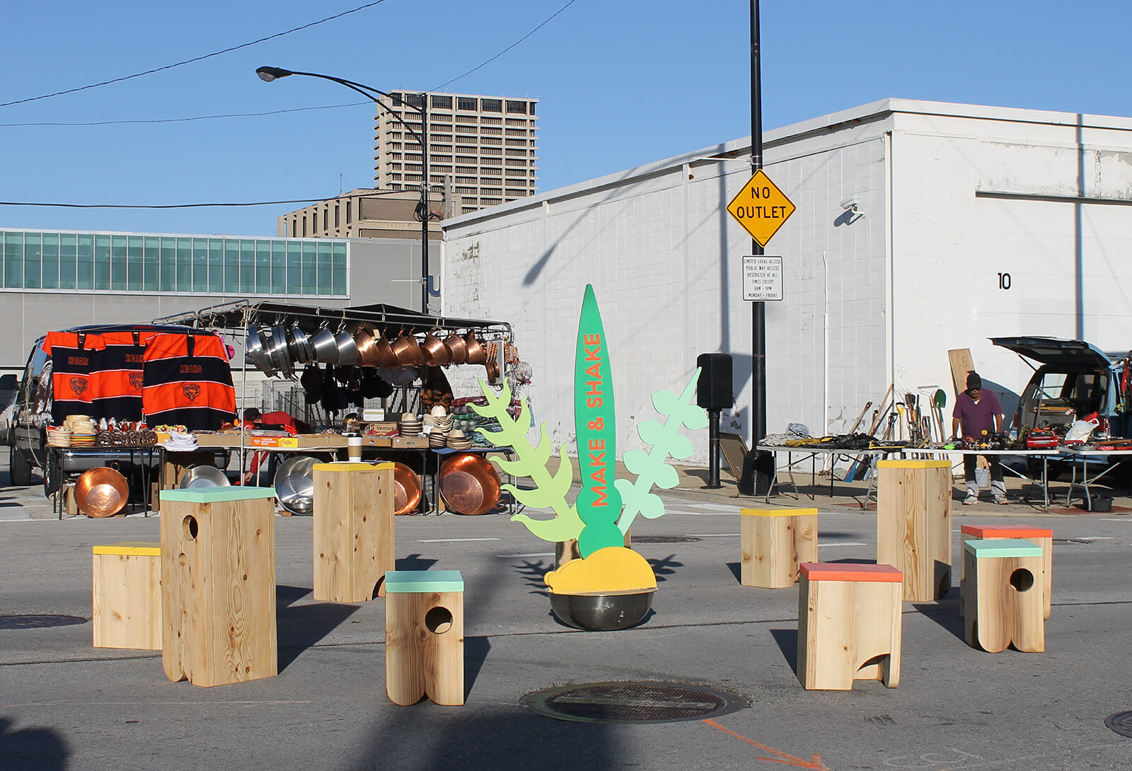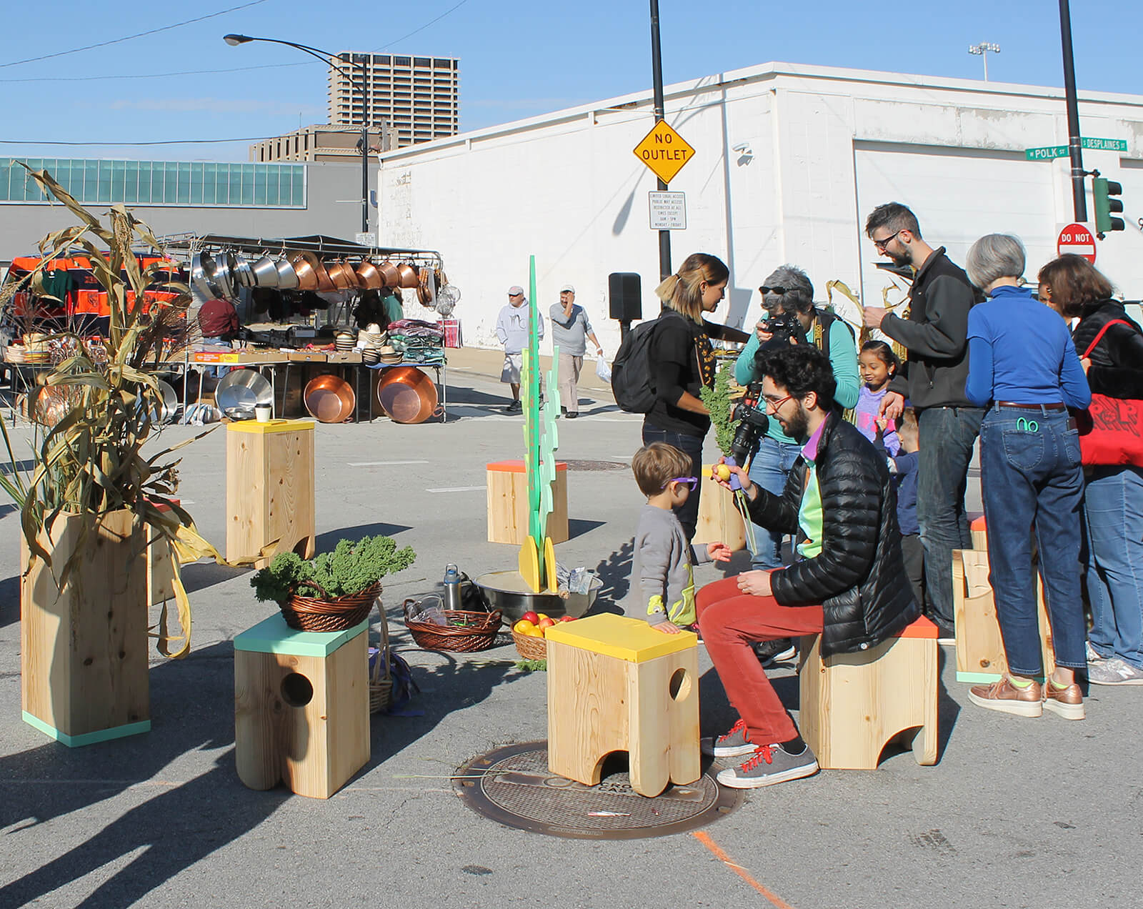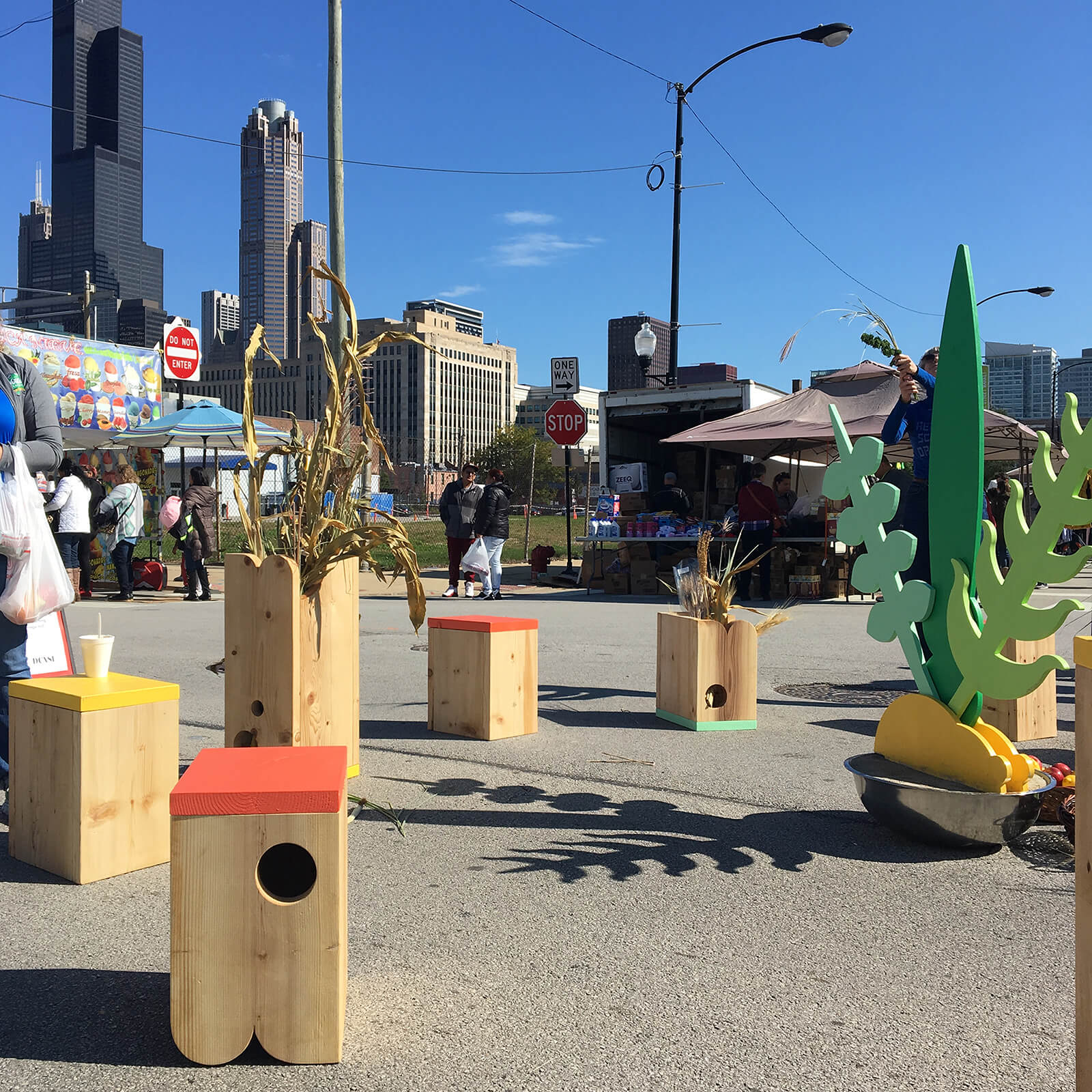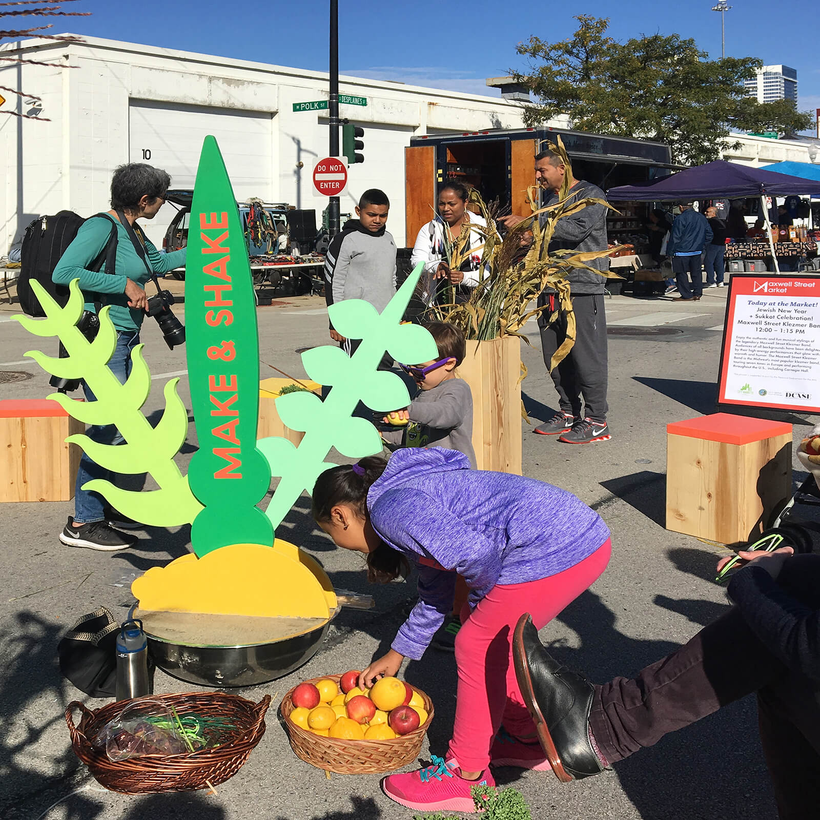 A family of street furniture pods provide seating, bins for workshop supplies, and temporary work surfaces. In collaboration with artist Leslie Baum, visitors are guided to design and assemble their own lulavim, made from native species such as wild onion, prairie grass, corn stalk, and heirloom apples. A human-scaled, wobbling Lulav Placemaker broadcasts the workshop and invites visitors to use their whole bodies to shake the Lulav-inspired art object in all directions. After the event, the street furniture provides public seating for future happenings at the market.