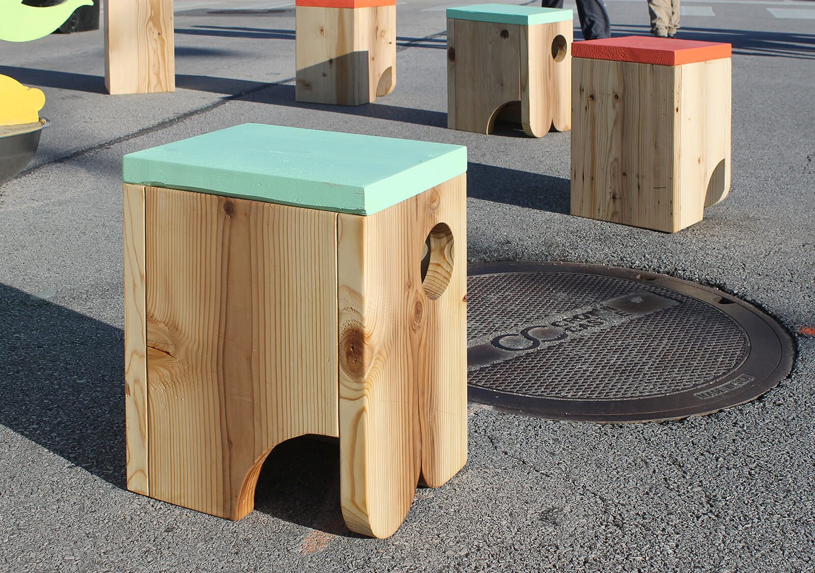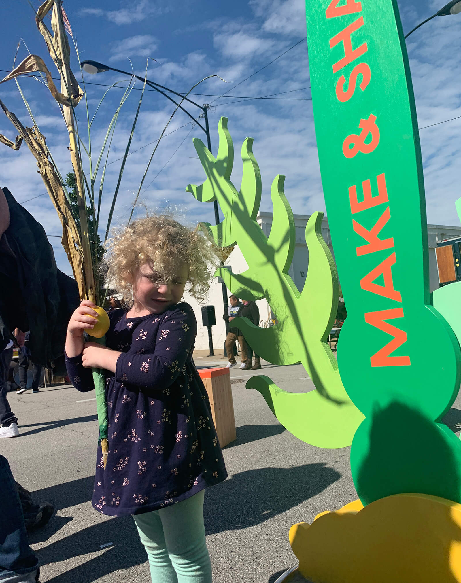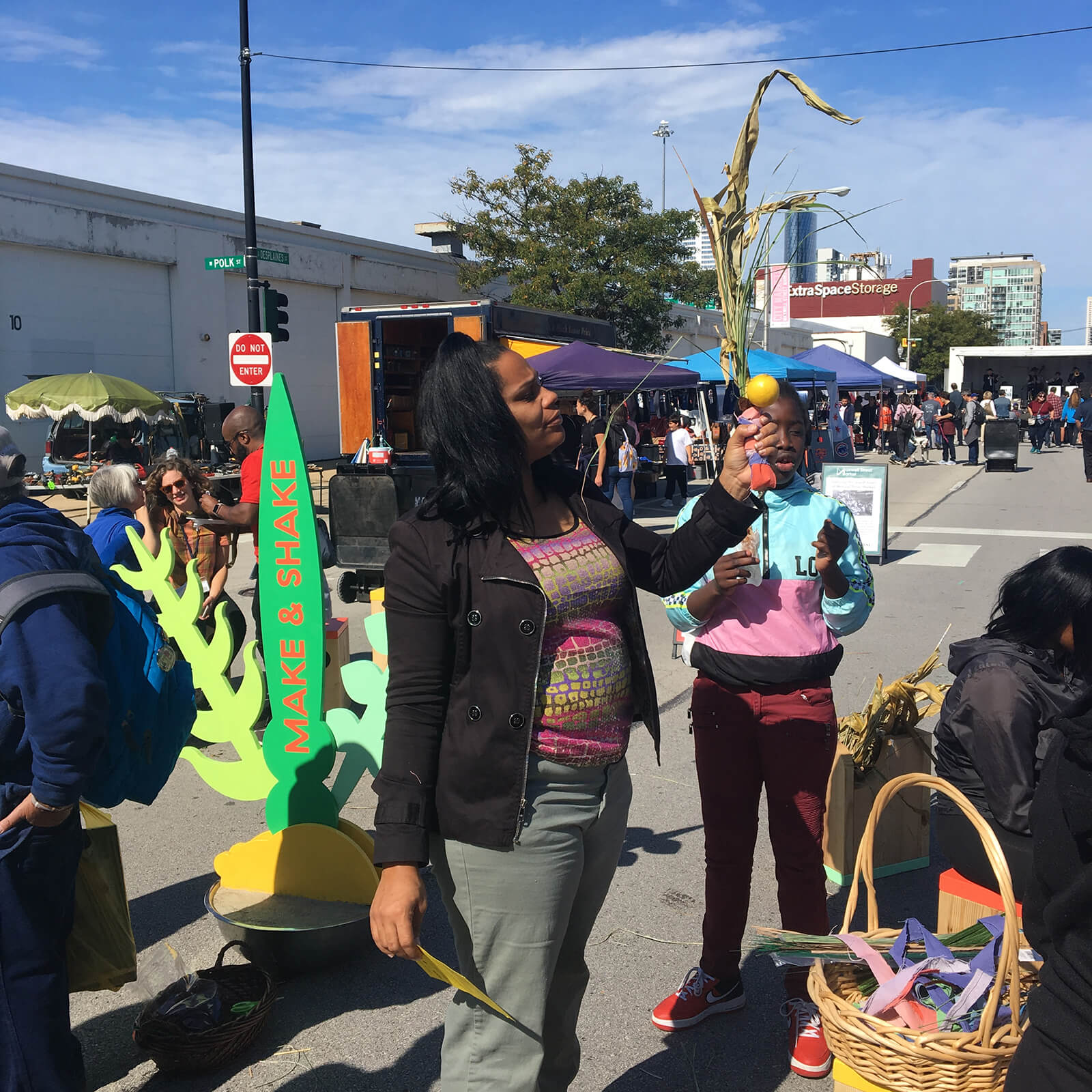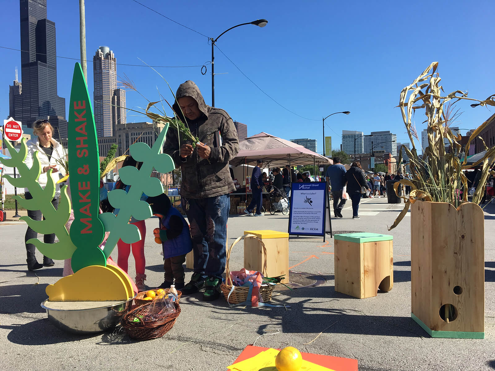A family of street furniture pods provide seating, bins for workshop supplies, and temporary work surfaces. In collaboration with artist Leslie Baum, visitors are guided to design and assemble their own lulavim, made from native species such as wild onion, prairie grass, corn stalk, and heirloom apples. A human-scaled, wobbling Lulav Placemaker broadcasts the workshop and invites visitors to use their whole bodies to shake the Lulav-inspired art object in all directions. After the event, the street furniture provides public seating for future happenings at the market.