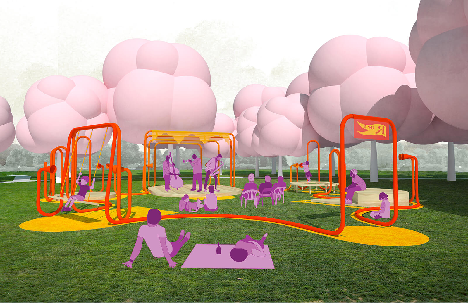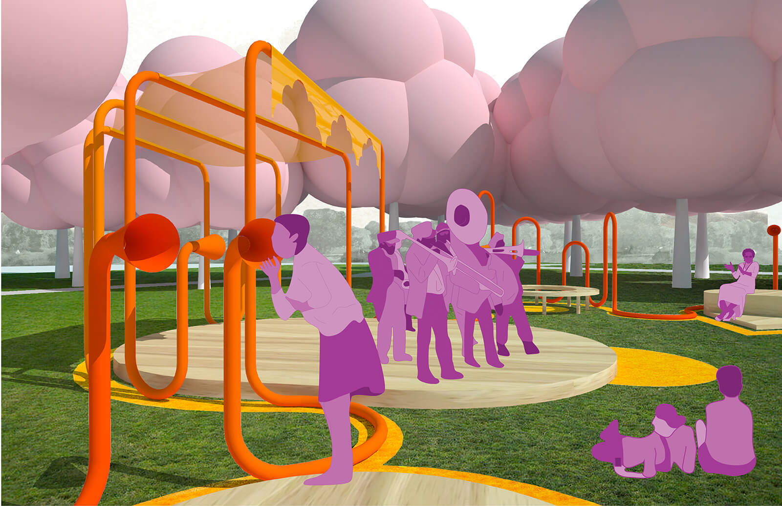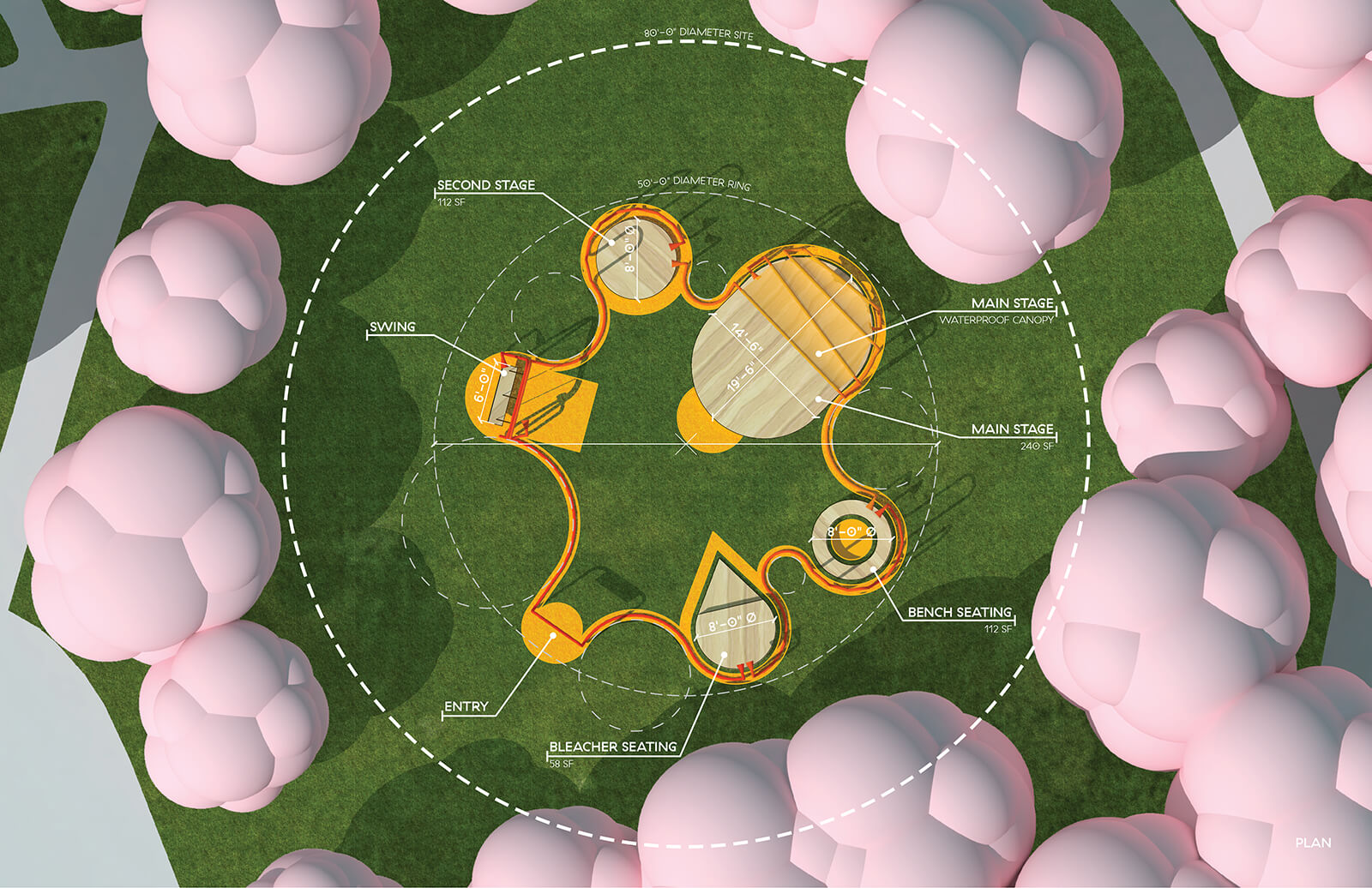 Each sound tube twists and turns in space to delineate five “pockets” of activity along the perimeter of the ring, accentuated by athletic-field-like turf paint graphics. The largest pocket provides a sheltered enclosure for the main stage of performance. The cutout pattern of a waterproof fabric canopy overhead recalls the distinctive silhouette of the original 1912 Ragdale Ring arcade and shelters performers from the elements. Other perimeter pockets create opportunities for a secondary stage, bleacher seating, bench seating, and a porch swing. The sound tubes link each pocket into an aural network. As a non-hierarchical amphitheatre, Ragdale Sings invites performers to explore and experiment with nontraditional and distributed performance setups in and around the ring.