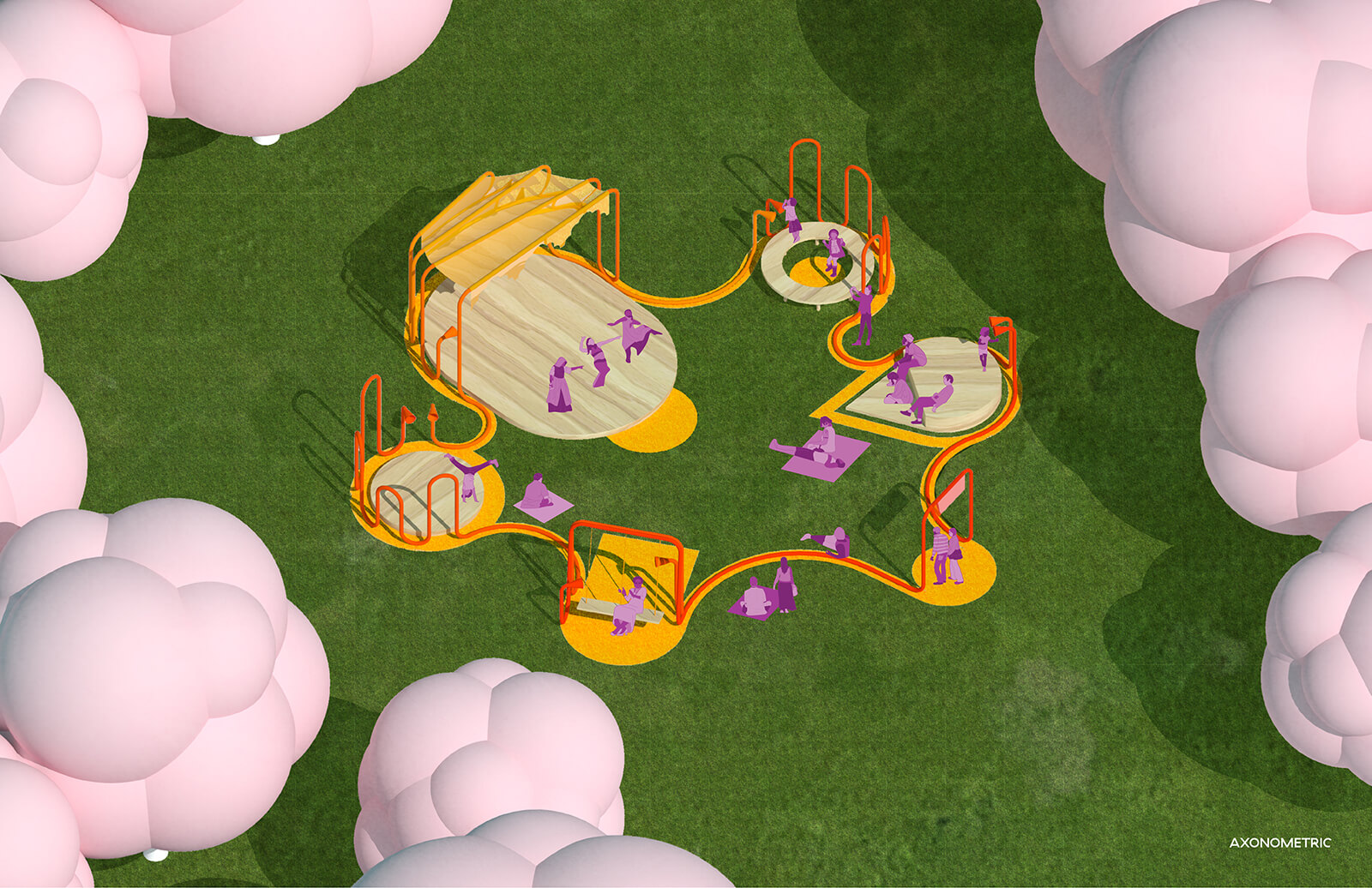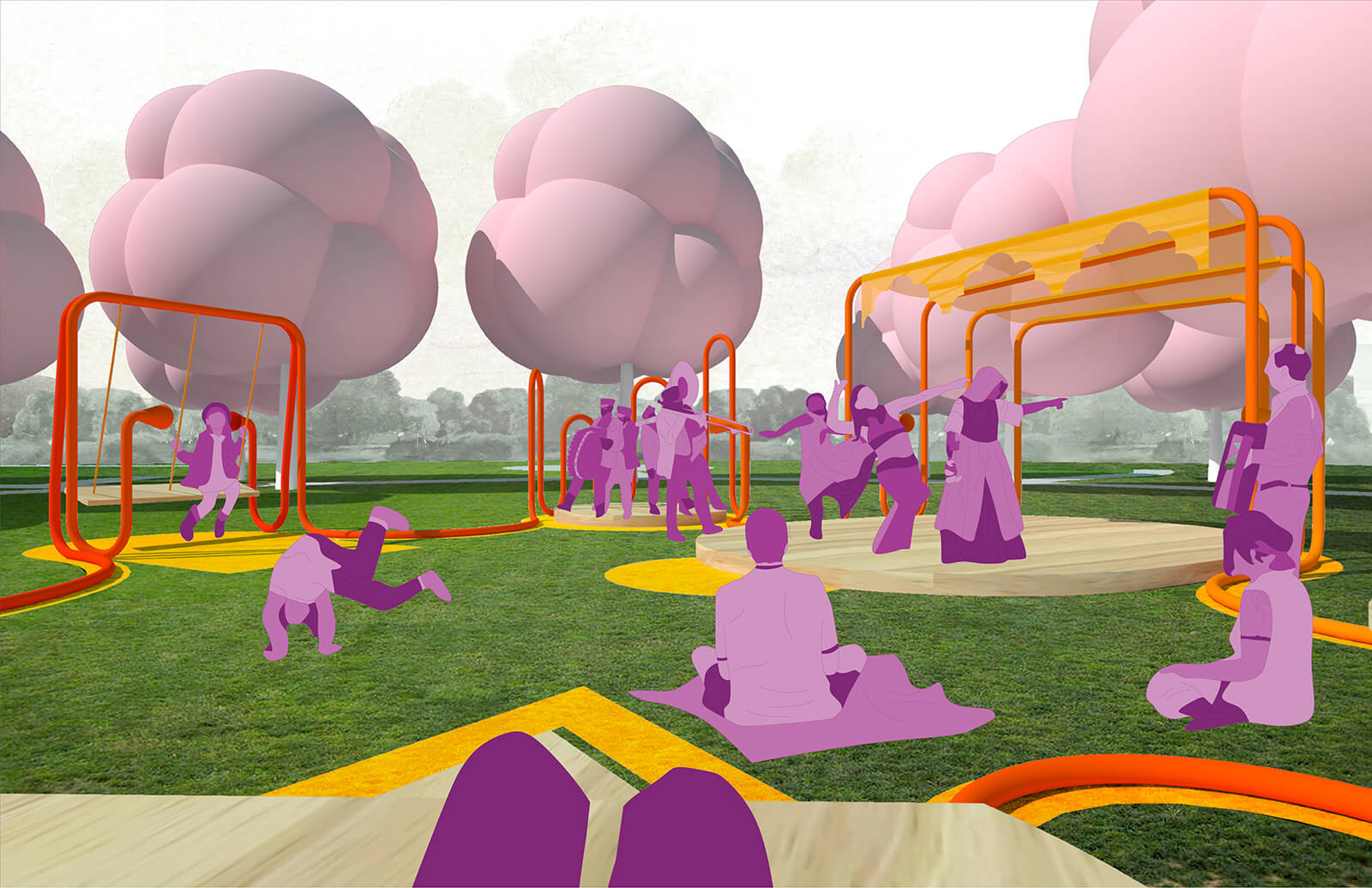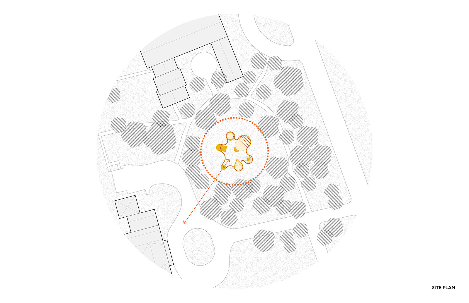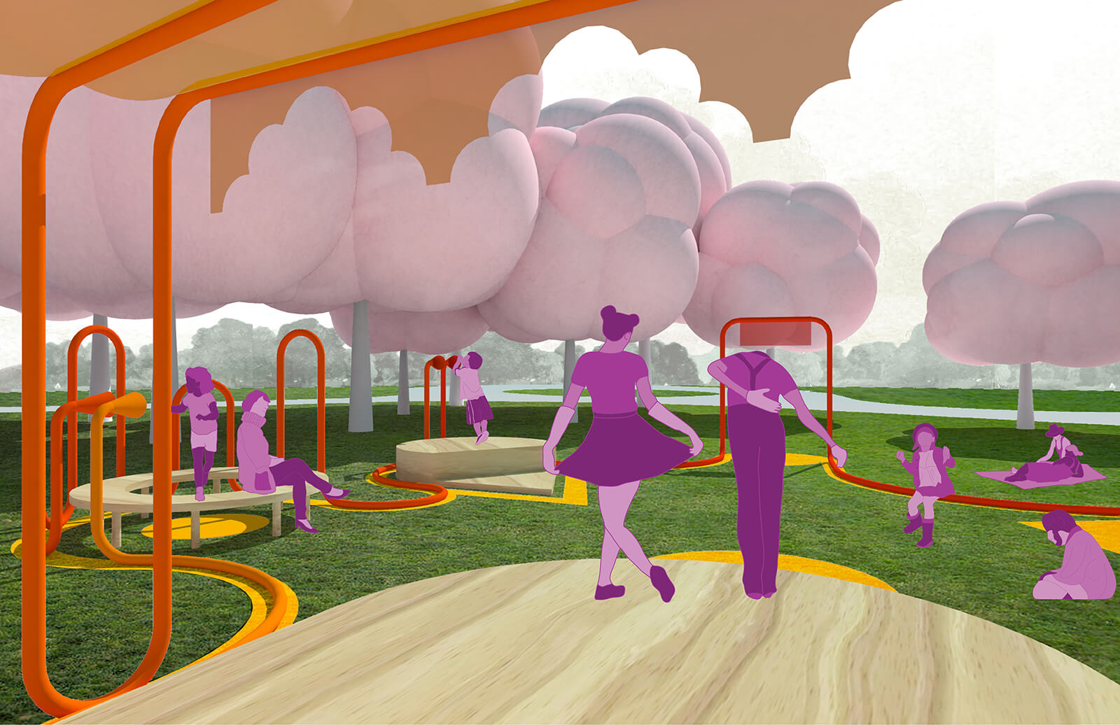 Each sound tube twists and turns in space to delineate five “pockets” of activity along the perimeter of the ring, accentuated by athletic-field-like turf paint graphics. The largest pocket provides a sheltered enclosure for the main stage of performance. The cutout pattern of a waterproof fabric canopy overhead recalls the distinctive silhouette of the original 1912 Ragdale Ring arcade and shelters performers from the elements. Other perimeter pockets create opportunities for a secondary stage, bleacher seating, bench seating, and a porch swing. The sound tubes link each pocket into an aural network. As a non-hierarchical amphitheatre, Ragdale Sings invites performers to explore and experiment with nontraditional and distributed performance setups in and around the ring.