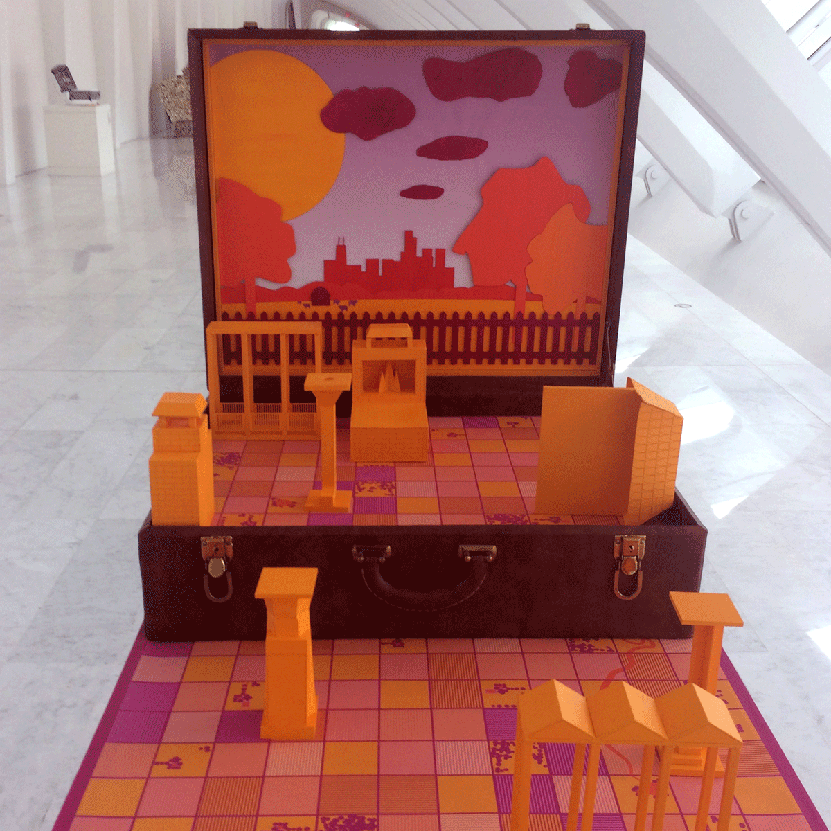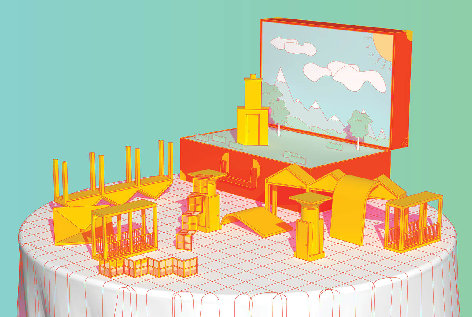 The Portmanteau Portmanteau is a set of architectural playthings that pack multiple spatial identities into one brimming suitcase. Just as a linguistic portmanteau seamlessly combines two existing words, this series of architectural portmanteaux seamlessly blends nuggets of architectural identity (typologies, behaviors, aesthetics, and character) into single toy-like objects. In turn, each architectural portmanteau may be combined with other portmanteaux to form fantastic compound “sentences” within the dioramic interior of the suitcase. For example, study a stindow (stair + window), ponder a porridor (porch + corridor), or woolgather over a woof (wall + roof). For ages 3 and up.
