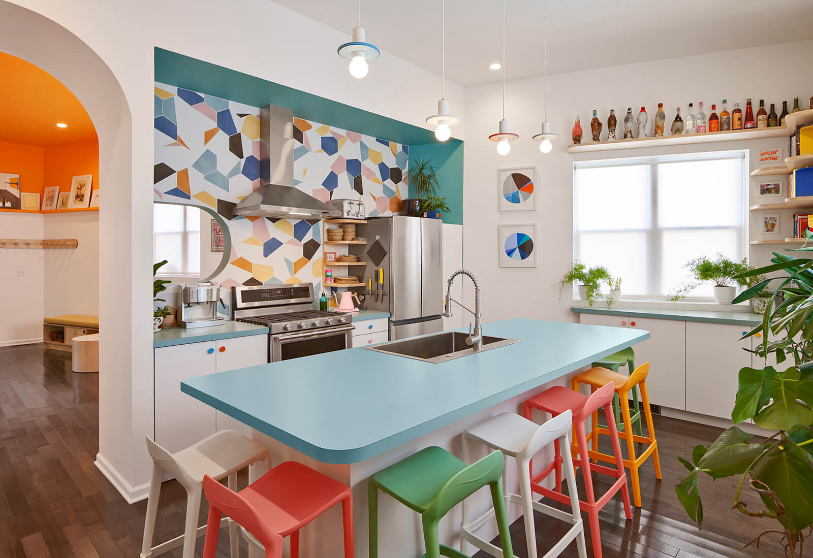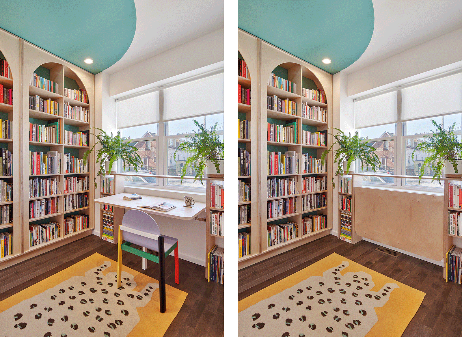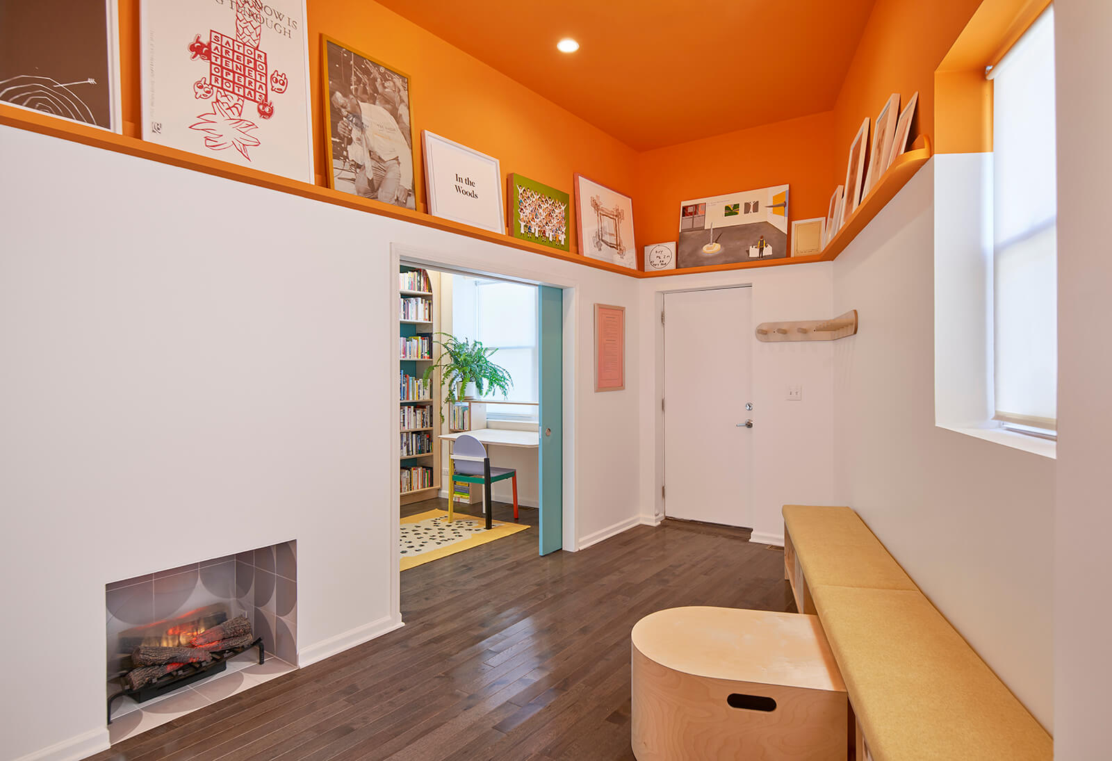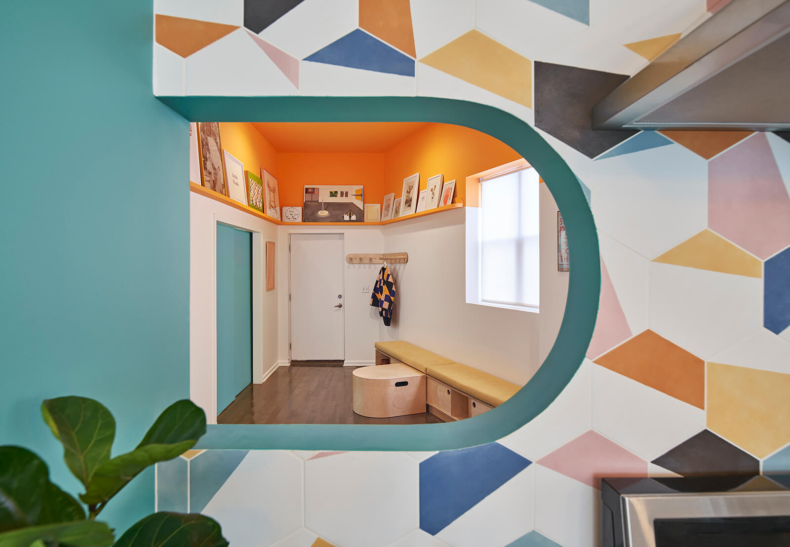 This gut rehab design for a side-by-side two-flat in Chicago includes one owner-occupied unit and a residency for BIPOC artists to rest, rejuvenate, and take care. The interior design choreographs intimate living arrangements within a very modest footprint by incorporating custom built-in furnishings that maximize usable surfaces within the confines of a small existing trapezoidal plan. Compact yet shapely, efficient yet pleasurable, the design delights in vibrant colors, half-round shapes, and ample opportunities for the display of art and artifacts. The living room doubles as a gathering space for small cultural events and the kitchen doubles as a demonstration venue for culinary programs. The study features a custom fold-out desk and bookshelves specifically sized for the artist residency's eclectic book collection.