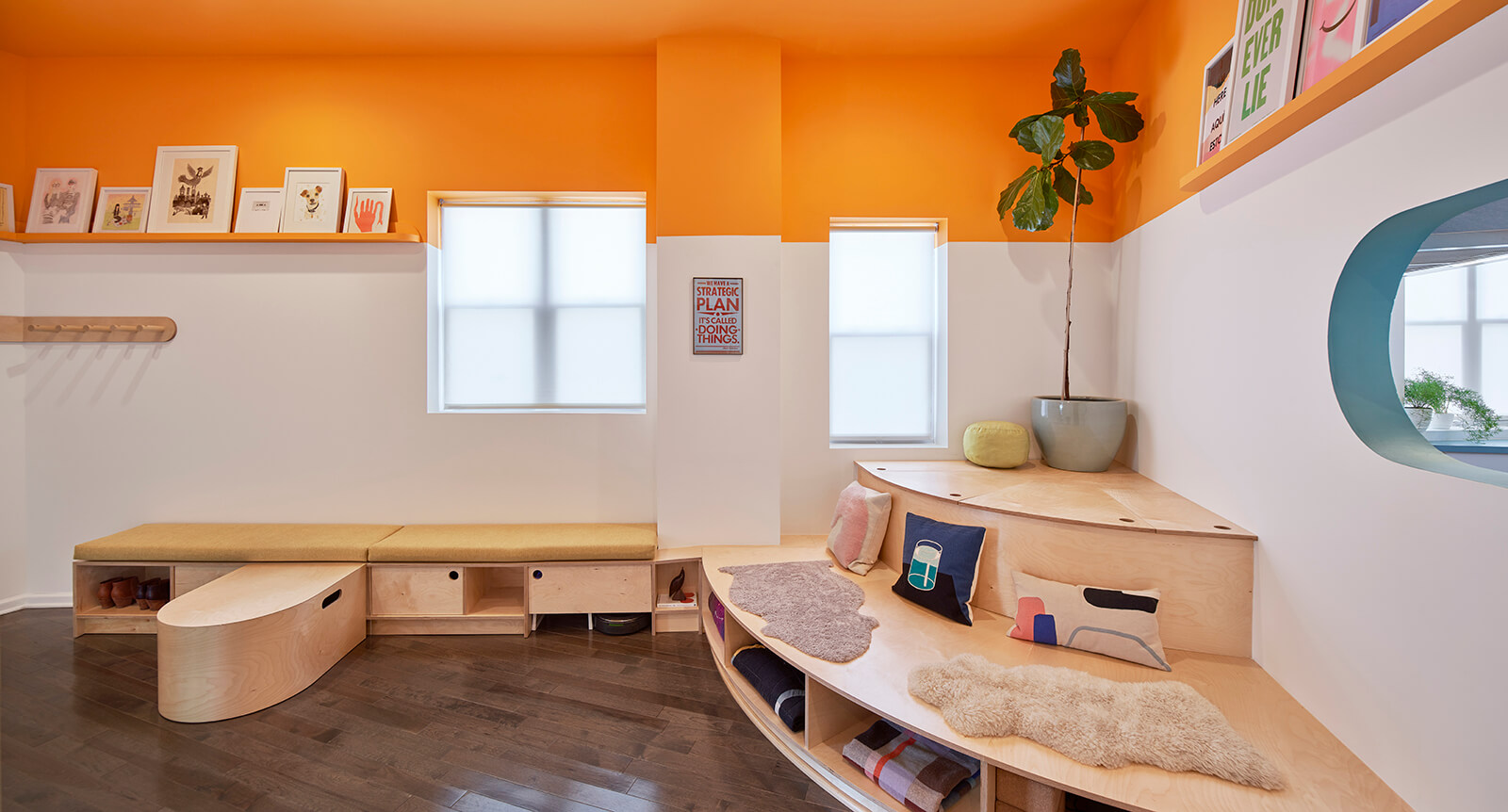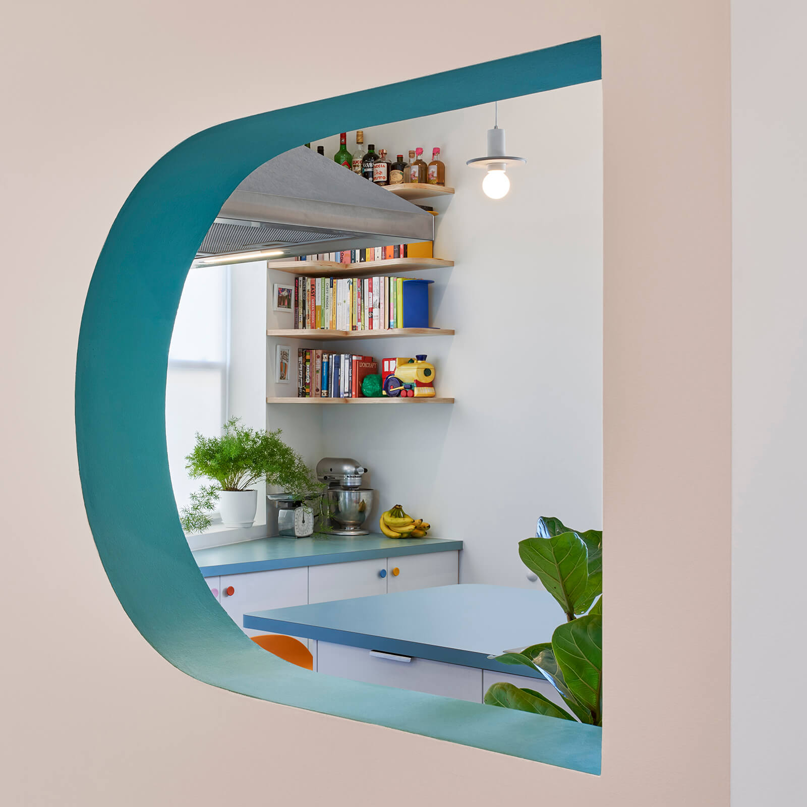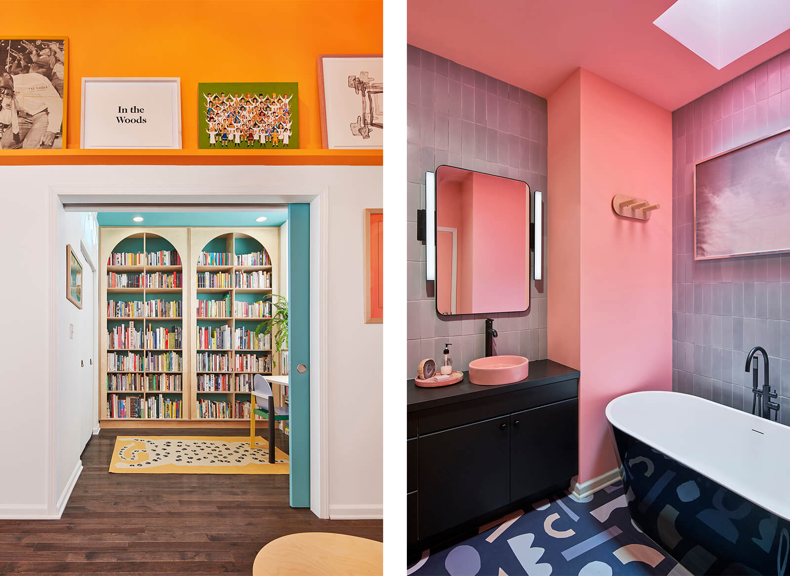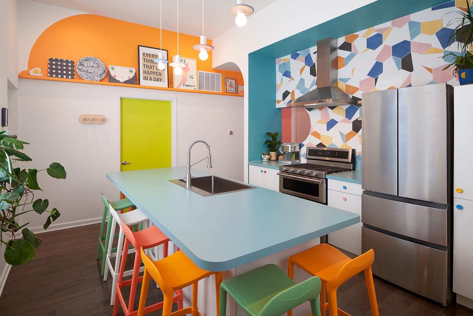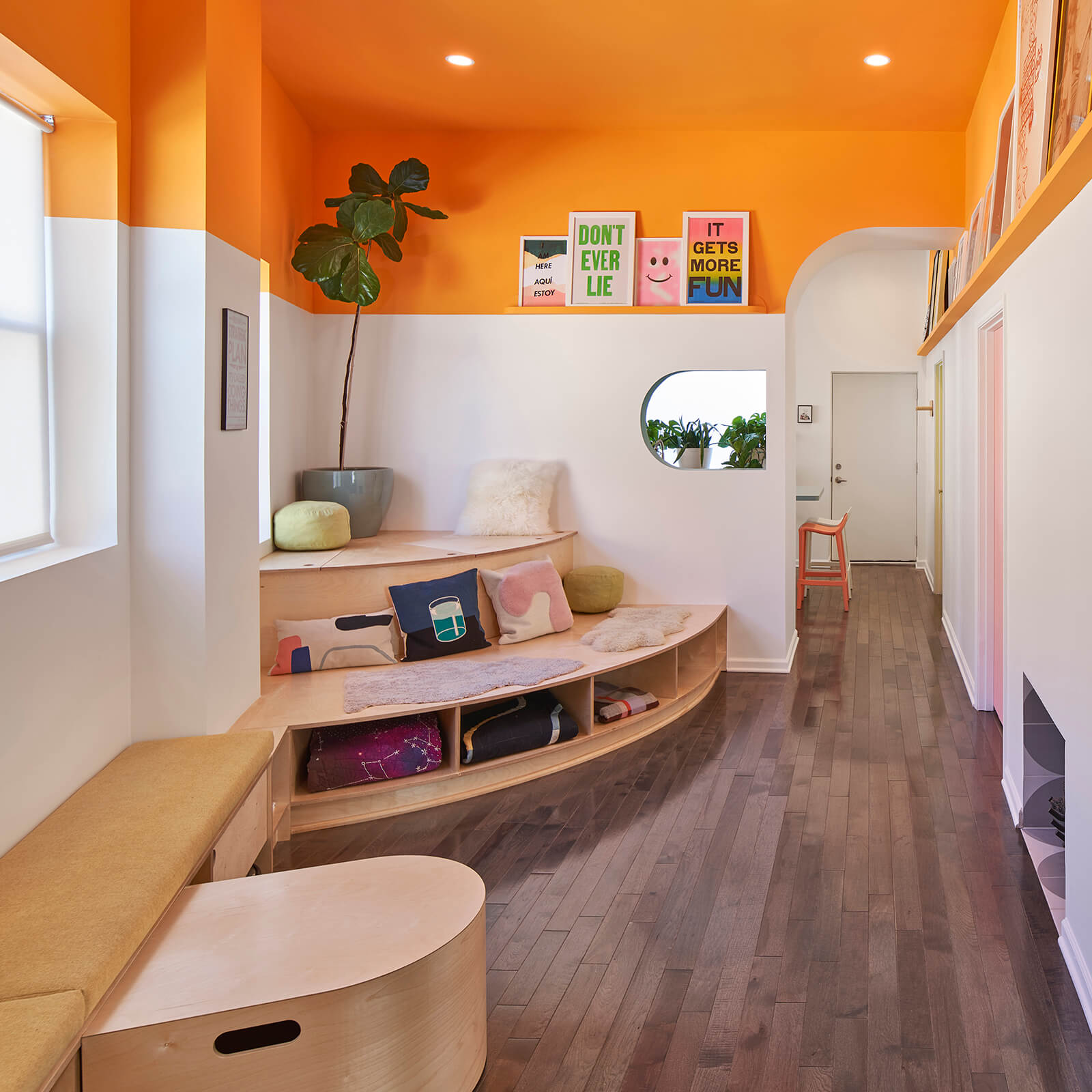 This gut rehab design for a side-by-side two-flat in Chicago includes one owner-occupied unit and a residency for BIPOC artists to rest, rejuvenate, and take care. The interior design choreographs intimate living arrangements within a very modest footprint by incorporating custom built-in furnishings that maximize usable surfaces within the confines of a small existing trapezoidal plan. Compact yet shapely, efficient yet pleasurable, the design delights in vibrant colors, half-round shapes, and ample opportunities for the display of art and artifacts. The living room doubles as a gathering space for small cultural events and the kitchen doubles as a demonstration venue for culinary programs. The study features a custom fold-out desk and bookshelves specifically sized for the artist residency's eclectic book collection.