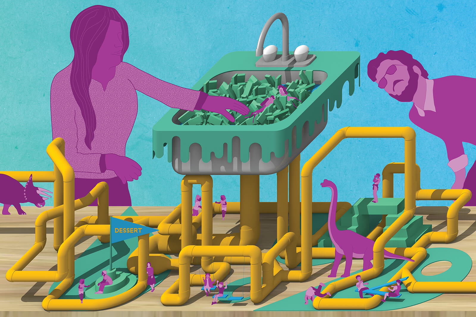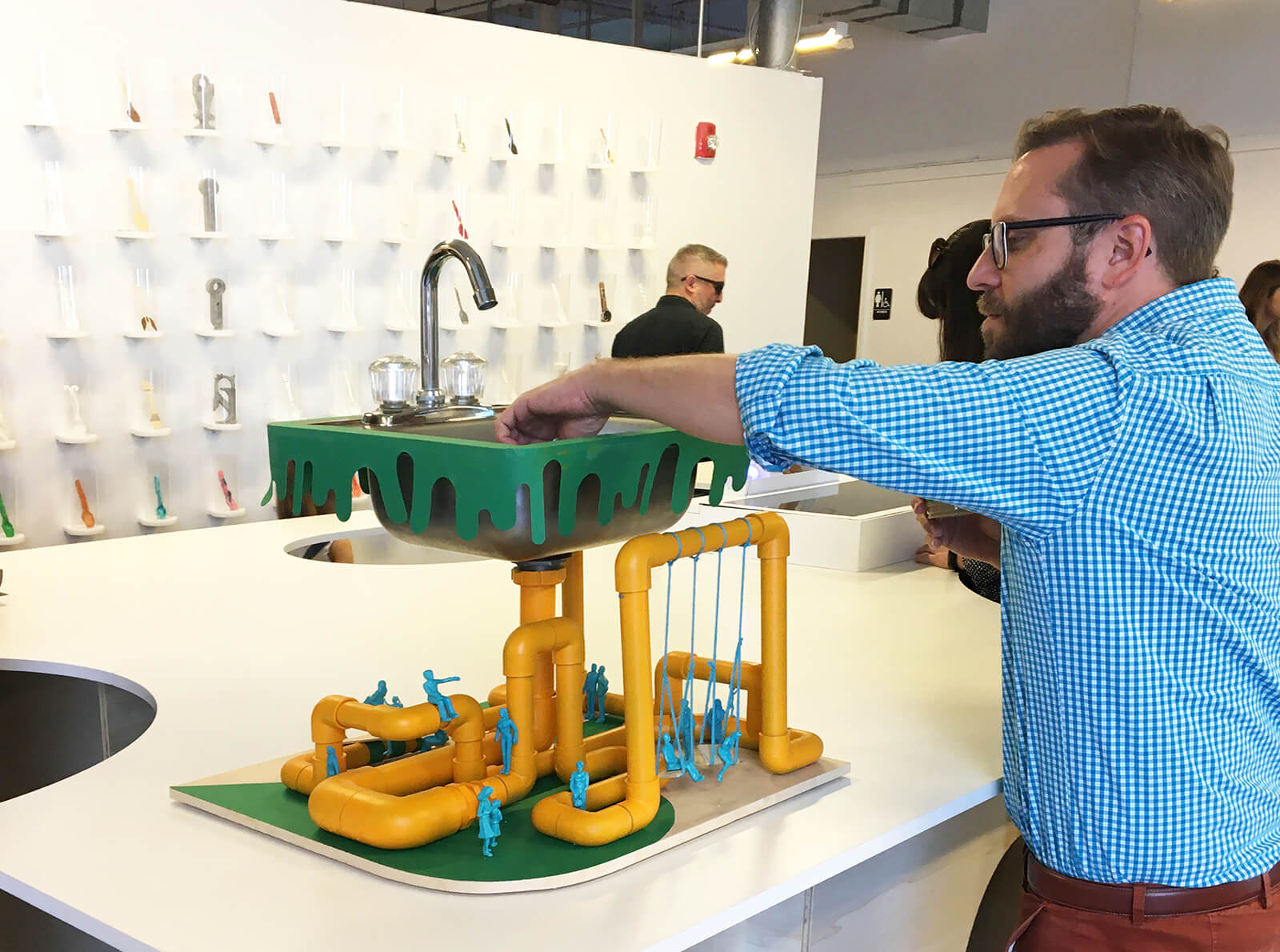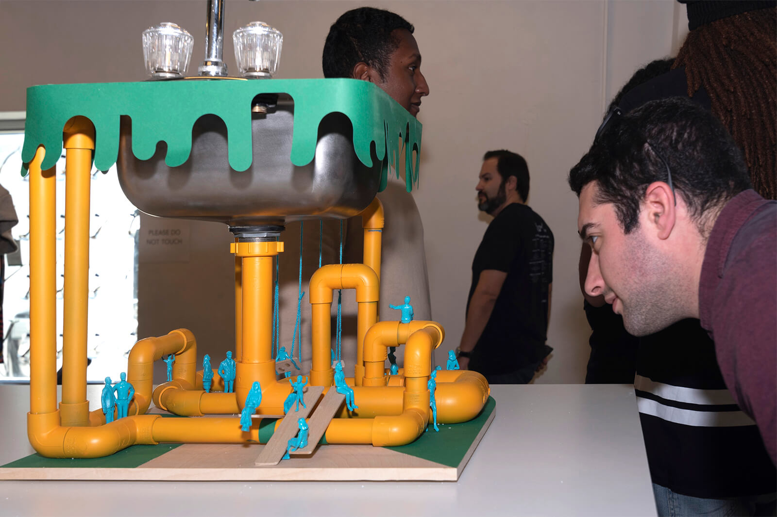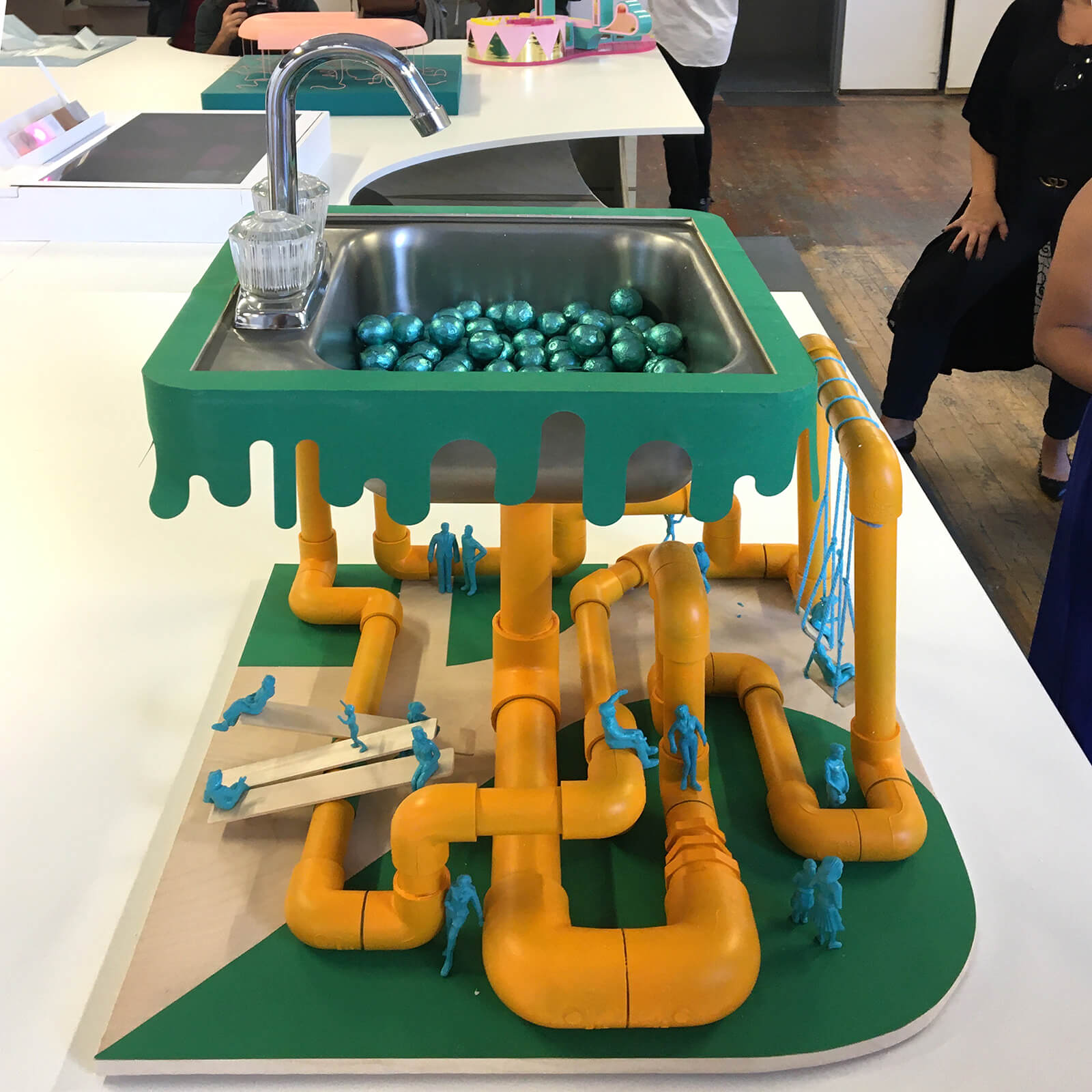 This project re-enacts the most over-the-top shared ice cream confection originating from South Florida*: the Kitchen Sink. This important household plumbing fixture-meets-oversized-helping-of-dessert is over-scaled precisely to initiate a shared indulgent revelry. The project operates at multiple scales of architectural and edible pleasure. On one hand, it is a 1:1 architectural fixture emitting over-exuberant drain piping. On the other hand, it is a 1:50 scale model of a seriously playful other world in which the undulating piping creates a range of human spaces and experiences around it. Most importantly, it is also an open candy bowl, offering sweets to all passersby and their companions.