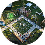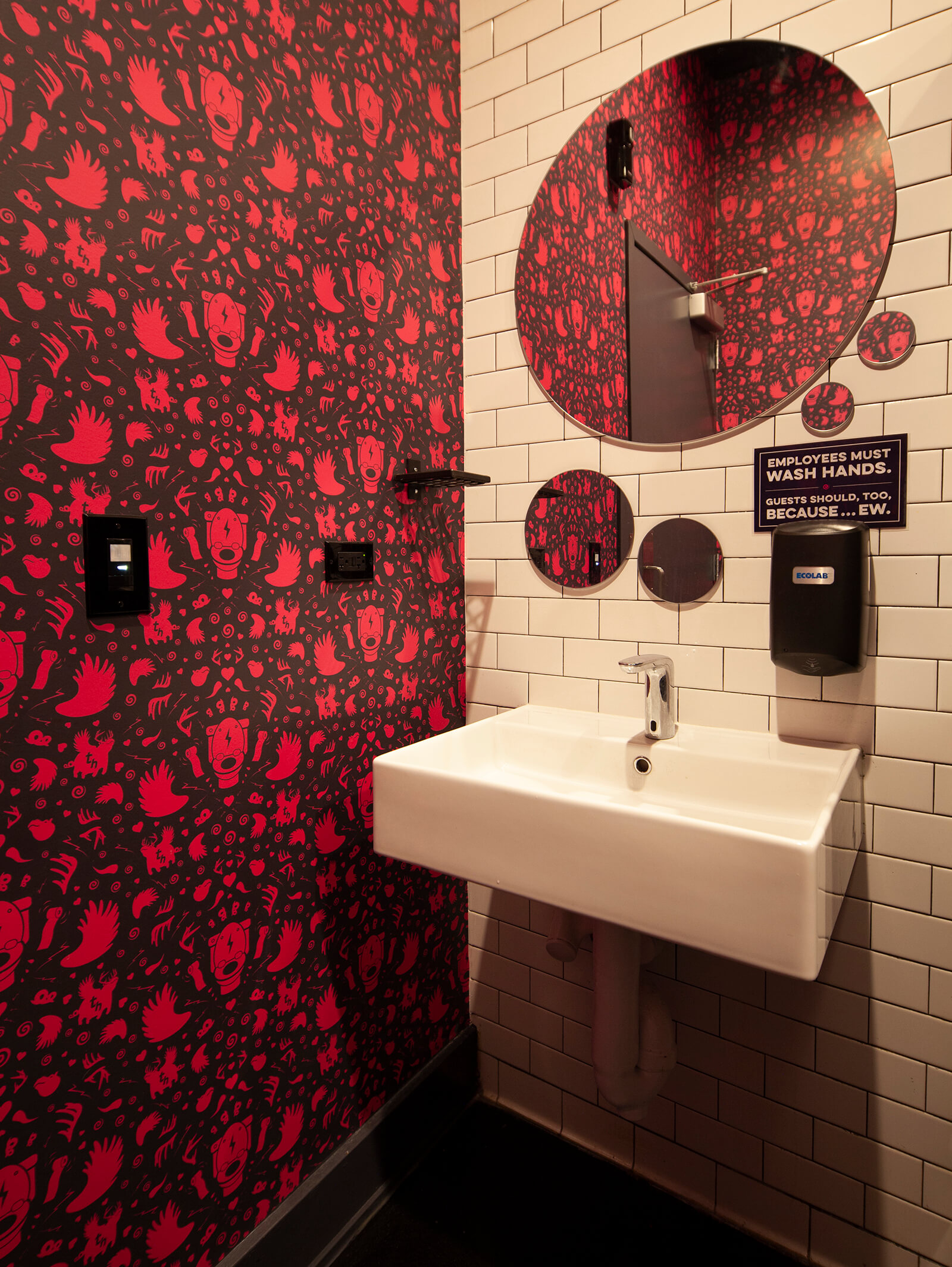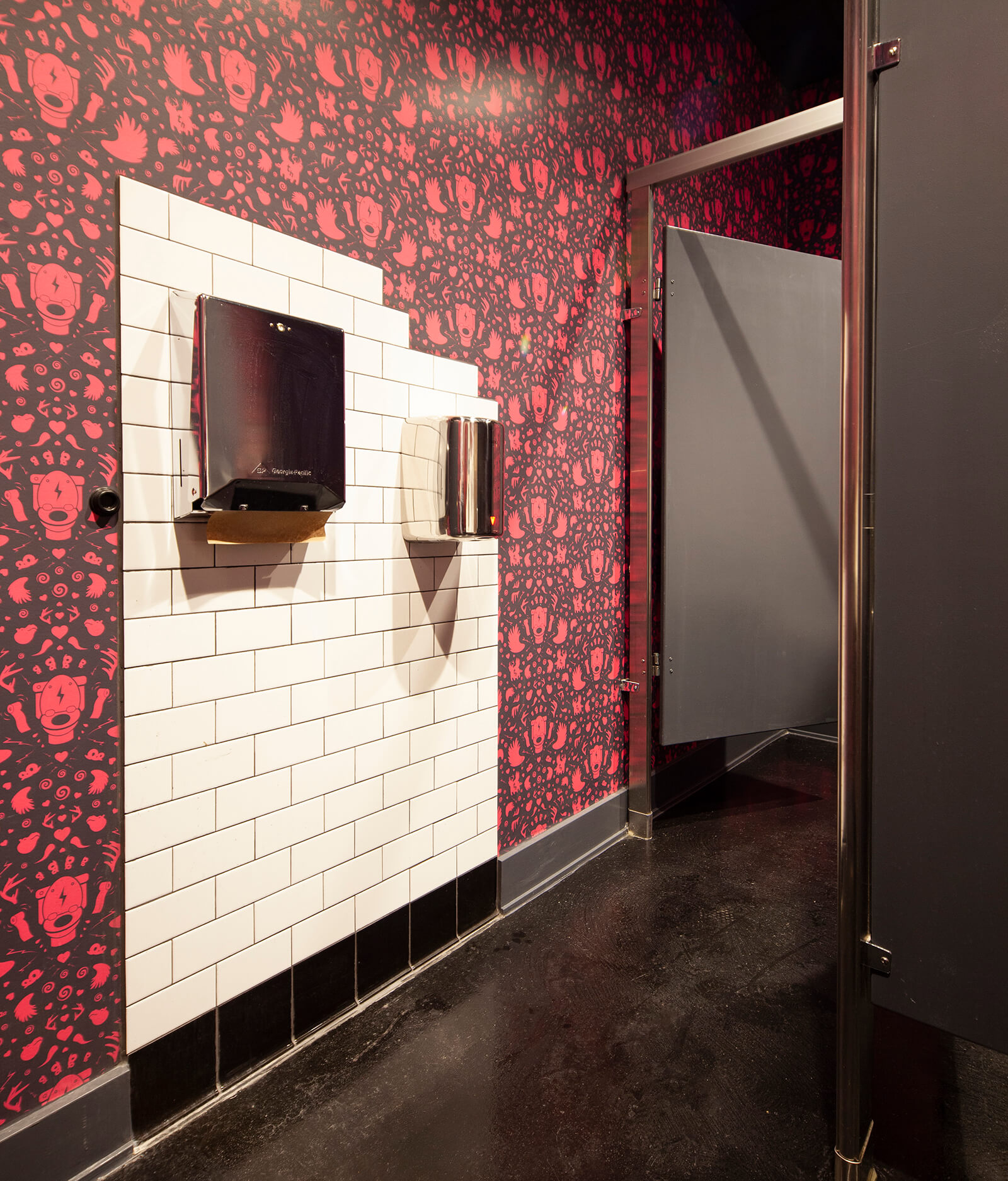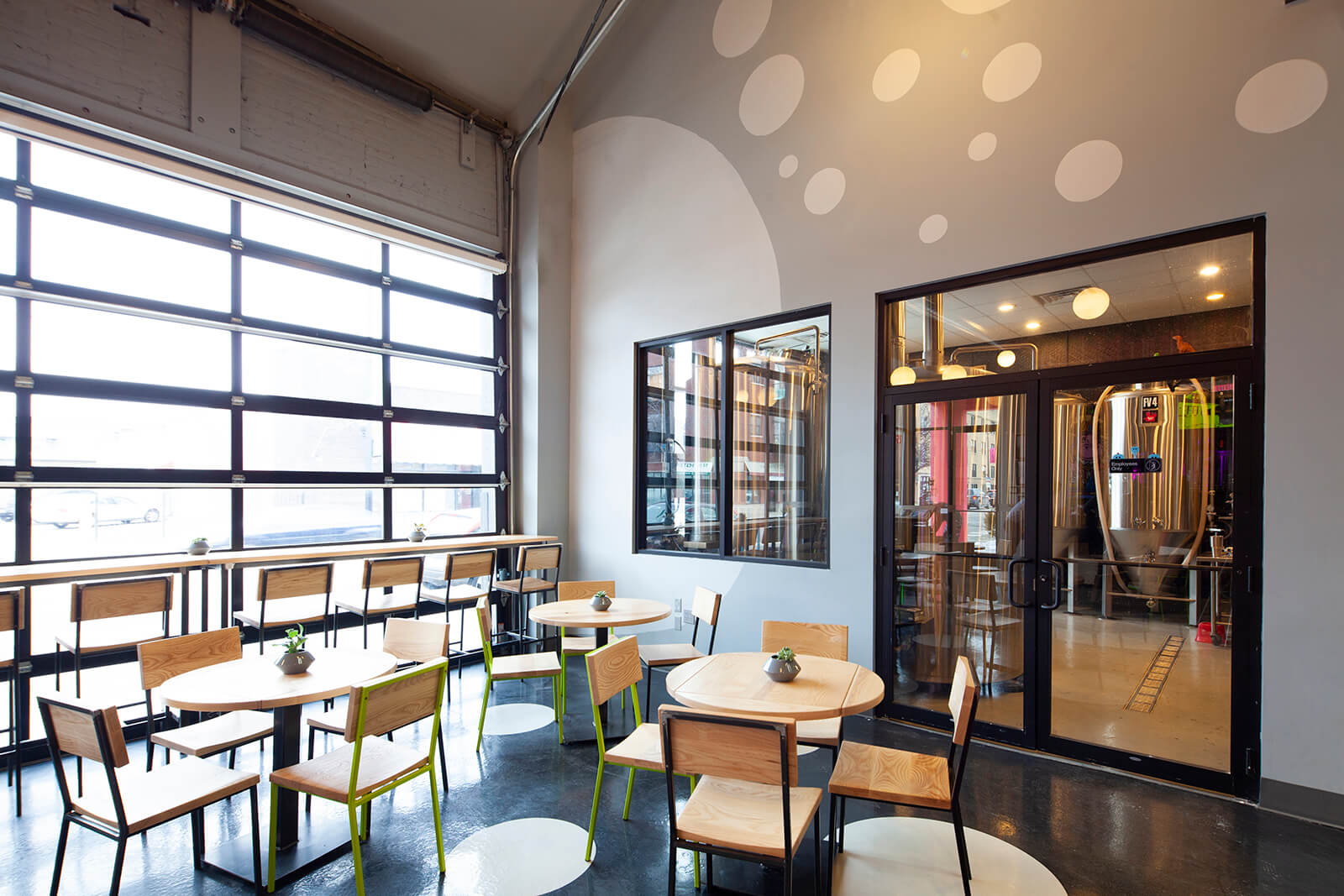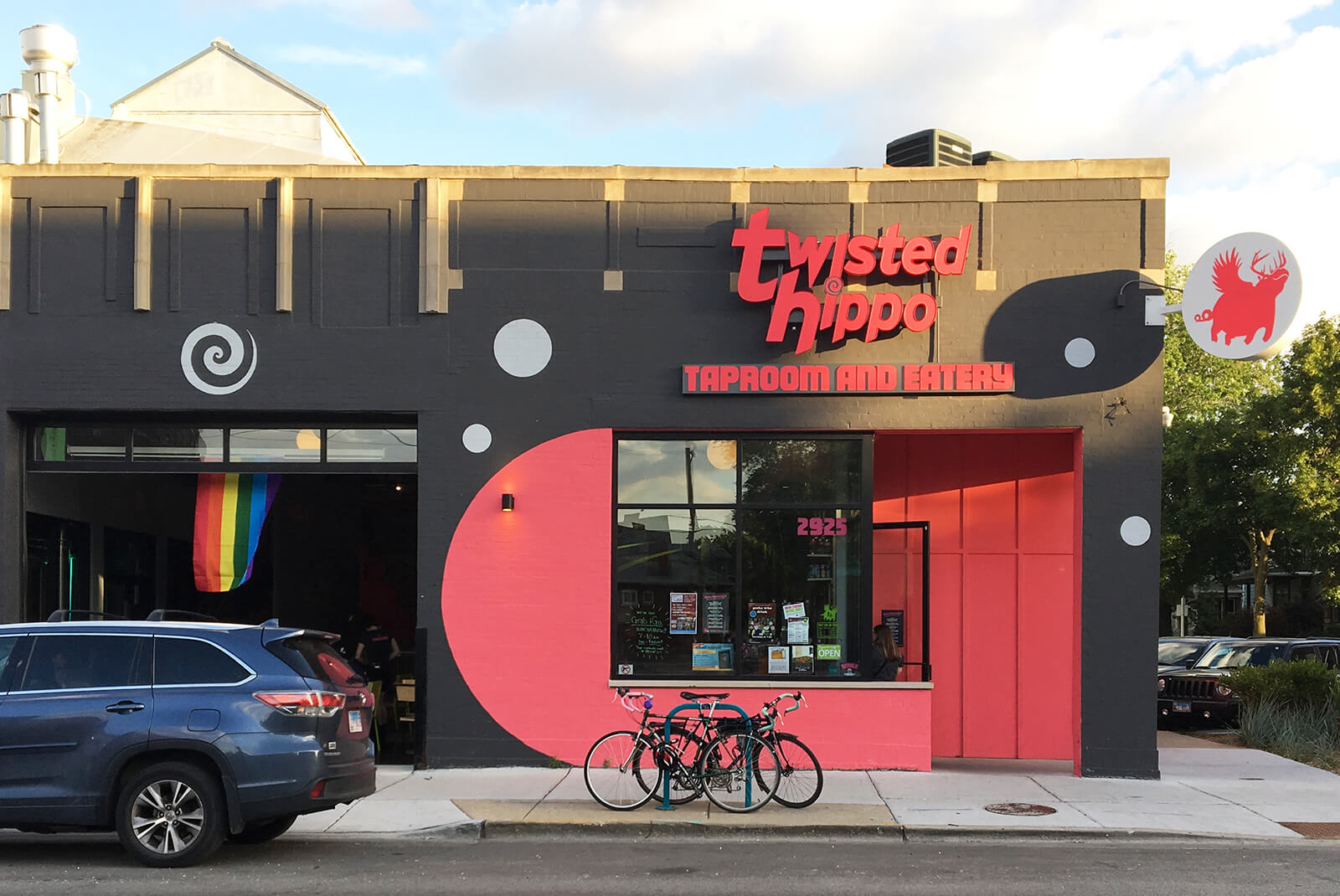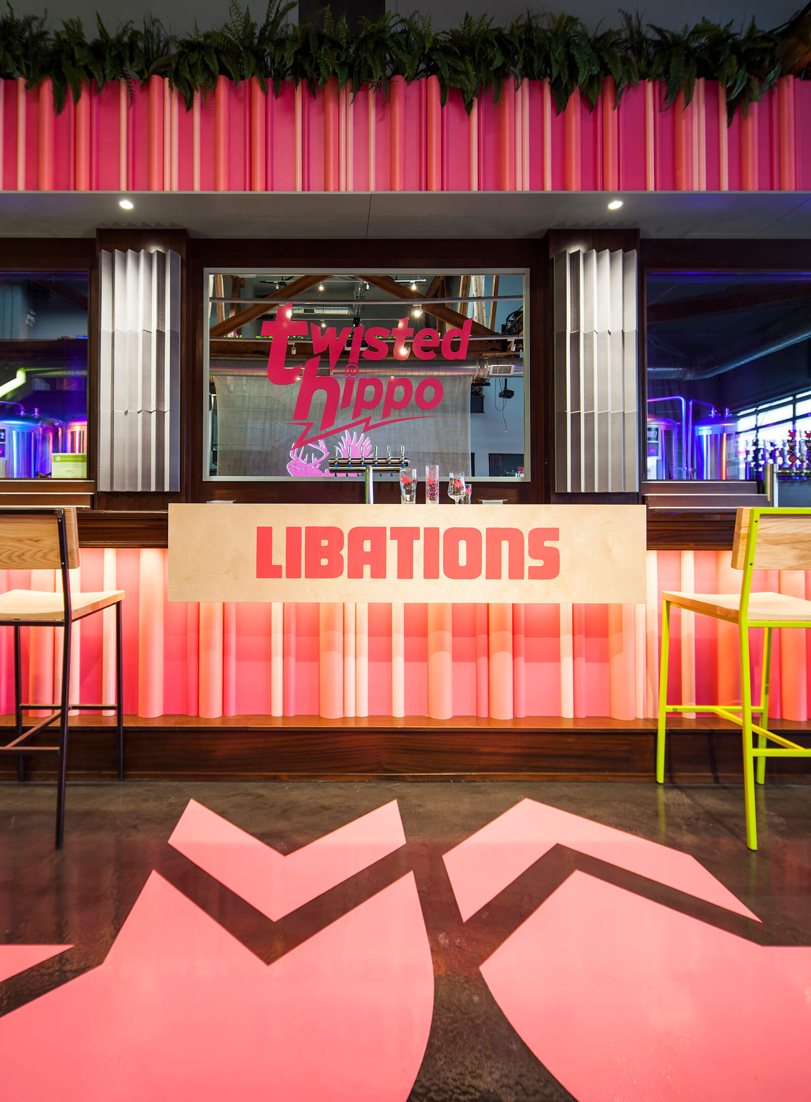 Our exterior signage design and interior architecture radically transform an existing space to create identity and cultivate community for Twisted Hippo Taproom and Eatery, located in Chicago's Albany Park neighborhood. By positioning vibrantly colored supergraphics and flora within a cavernous existing interior, the design deploys a budget-conscious strategy and material set to articulate a series of companionable “little worlds,” each with their own specificity, intimacy, and character. Bubbly wall and floor graphics articulate the 'Carbonated Cafe' up front; custom tables, planters, and an animated scrim position the 'Communal Core' in the middle; and a custom acoustic felt cloud installation shelters an intimate banquette and performance platform in the rear. Embracing bold graphics, color, and texture, the design cultivates a character as "weird and approachable" as Twisted Hippo.